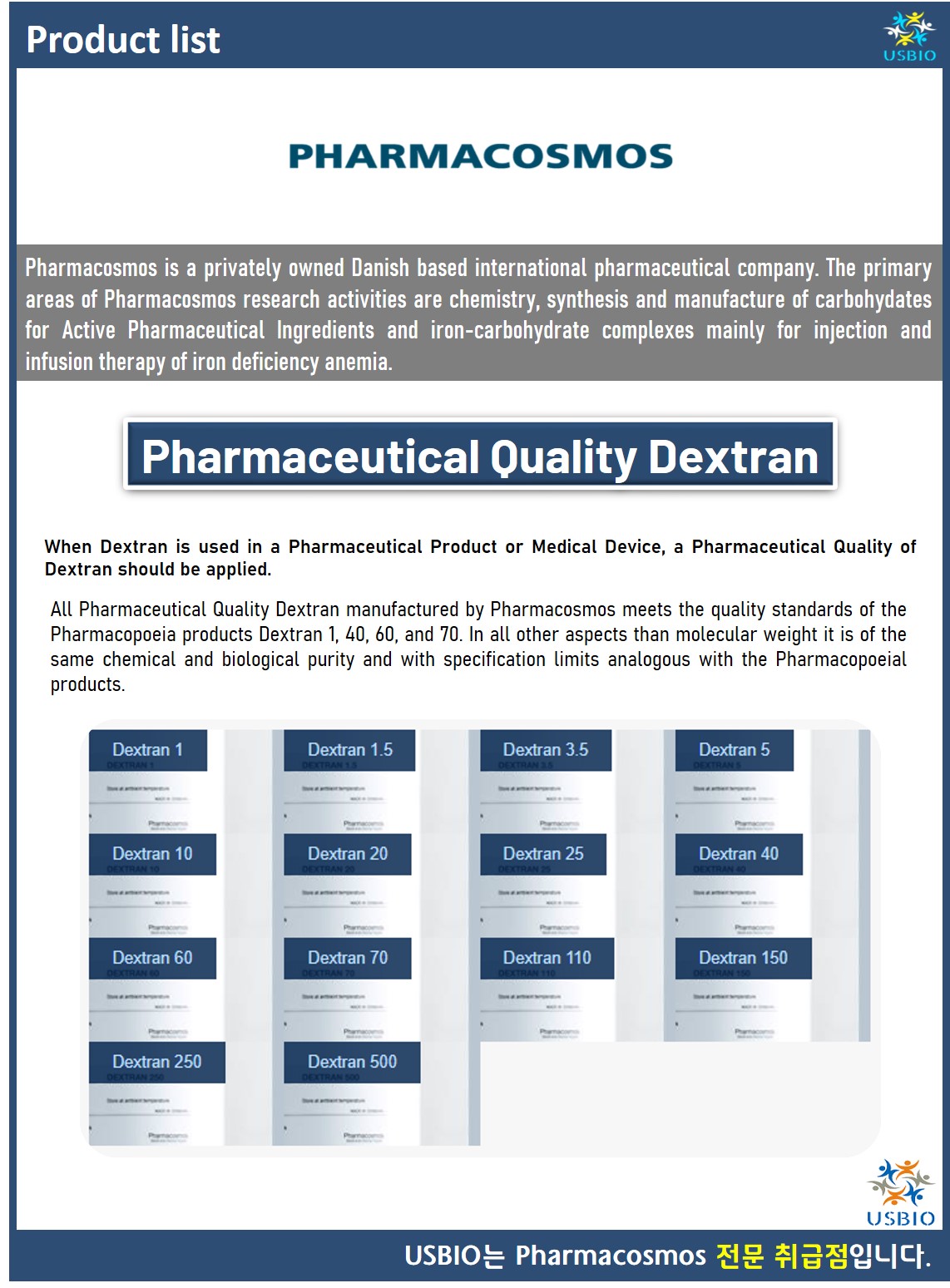 Pharmacosmos는 인간과 동물의 철분 결핍 빈혈 치료를 위한 의약품을 개발과 제조 및 판매하는 제약 회사입니다. Pharmacosmos는 환자와 의료 종사자에게 철 결핍성 빈혈 및 관련 상태에 대해 알리고 적절한 환자에게 해당 상태에 대해 승인된 치료에 대한 교육 및 정보를 제공하고 있으며 제약 및 기술적 사용을 위한 고급 탄수화물 개발 및 생산도 하고 있습니다. Pharmacosmos는 유기 용매의 사용을 완전히 피하는 생산 기술과 인체 의약품에 대한 가장 엄격한 cGMP 표준을 충족하는 품질 시스템을 통해 고유한 Dextran 품질을 제공하고 있습니다.