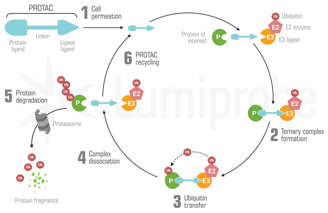 Proteolysis targeting chimeras (PROTACs) are cell-permeable heterobifunctional molecules that can remove specific proteins from the cell. One end of such molecule contains a ligand to bind to the target, and the second end recruits the E3 ligase complex. Close proximity results in substrate polyubiquitination and subsequent protein degradation by cellular proteasome.