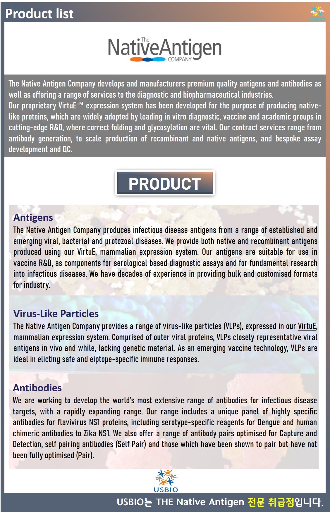 Native Antigen Company는 프리미엄 품질의 항원 및 항체를 개발 및 제조할 뿐만 아니라 진단 및 바이오 제약 산업에 다양한 서비스를 제공하는 업체입니다. Native Antigen Company의 독점적인 VirtuE™ 발현 시스템은 토착 유사 단백질을 생산하기 위한 목적으로 개발되었으며, 이는 정확한 접힘과 글리코실화가 필수적인 최첨단 R&D 분야의 선도적인 체외 진단, 백신 및 학술 그룹에서 널리 채택되고 있습니다. Native Antigen Company의 시약 포트폴리오는 계속해서 빠르게 확장되고 있으며 신흥 질병 연구를 위한 시약 및 키트의 주요 공급원으로 널리 인정받고 있습니다.