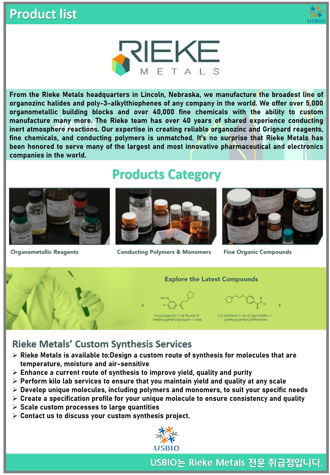 Rieke Metals는 세계 어느 회사보다도 가장 광범위한 유기아연 할로겐화물 및 폴리-3-알킬티오펜 라인을 제조하고 있습니다. Rieke Metals 팀은 불활성 대기 반응을 수행하는 데 40년 이상의 경험을 가지고 있으며, 믿을 수 있는 유기아연 및 그리냐르 시약, 정밀 화학물질, 전도성 고분자를 만드는 데 있어 전문성은 타의 추종을 불허합니다. Rieke Metals는 5,000가지 이상의 유기금속 빌딩 블록과 40,000가지 이상의 정밀 화학 물질을 제공하며 고객들이 원하는 제품을 위해 맞춤 제조 서비스를 제공하고 있습니다.