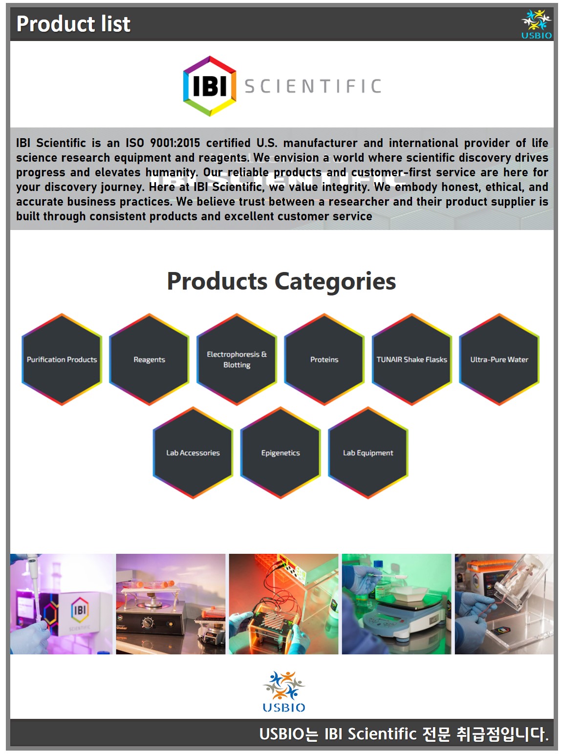 IBI Scientific은 ISO 9001:2015 인증을 받은 미국 제조업체이자 생명 과학 연구 장비, 추출 키트 및 시약의 국제 공급업체입니다. IBI Scientific의 제품으로는 실험실 장비, PCR 제품, 실험실 악세서리, 재조합 단백질, 실험실 동물성 제품, DNA Extraction, RNA Extraction,Culture Media, BETA Radiation Protection 등이 있으며 이외 많은 카테고리를 가지고 있습니다. IBI Scientific는 연구원과 제품 공급 업체 간의 신뢰가 일관된 제품과 우수한 고객 서비스를 통해 구축된다고 믿으며 과학적 발견이 발전을 주도하고 인류를 고양시키는 세상을 위해 노력하고 있습니다.