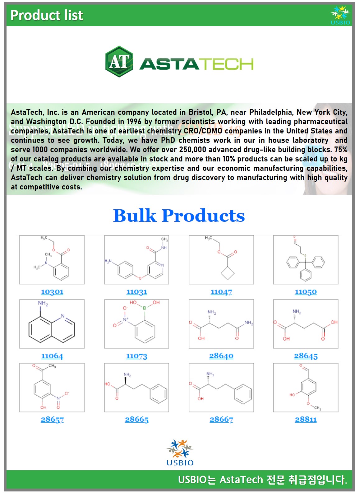 1996년에 선도적인 제약 회사의 연구원들이 모여 설립한 AstaTech는 미국 최초의 화학 CRO/CDMO 회사 중 하나이며 계속 성장하고 있습니다. 오늘날 100명 이상의 화학자(40% PH.D 또는 MS 학위 수준)를 보유하고 있으며 전 세계적으로 1000개 회사에 서비스를 제공하고 있습니다. AstaTech는 100,000개 이상의 고급 중간체 및 약물 유사 구성 요소를 제공합니다. 화학 전문 지식과 경제적인 제조 능력을 결합함으로써 AstaTech는 의약품 발견에서 제조에 이르기까지 화학 솔루션을 경쟁력 있는 비용으로 고품질의 제품을 제공하기 위해 노력하고 있습니다.