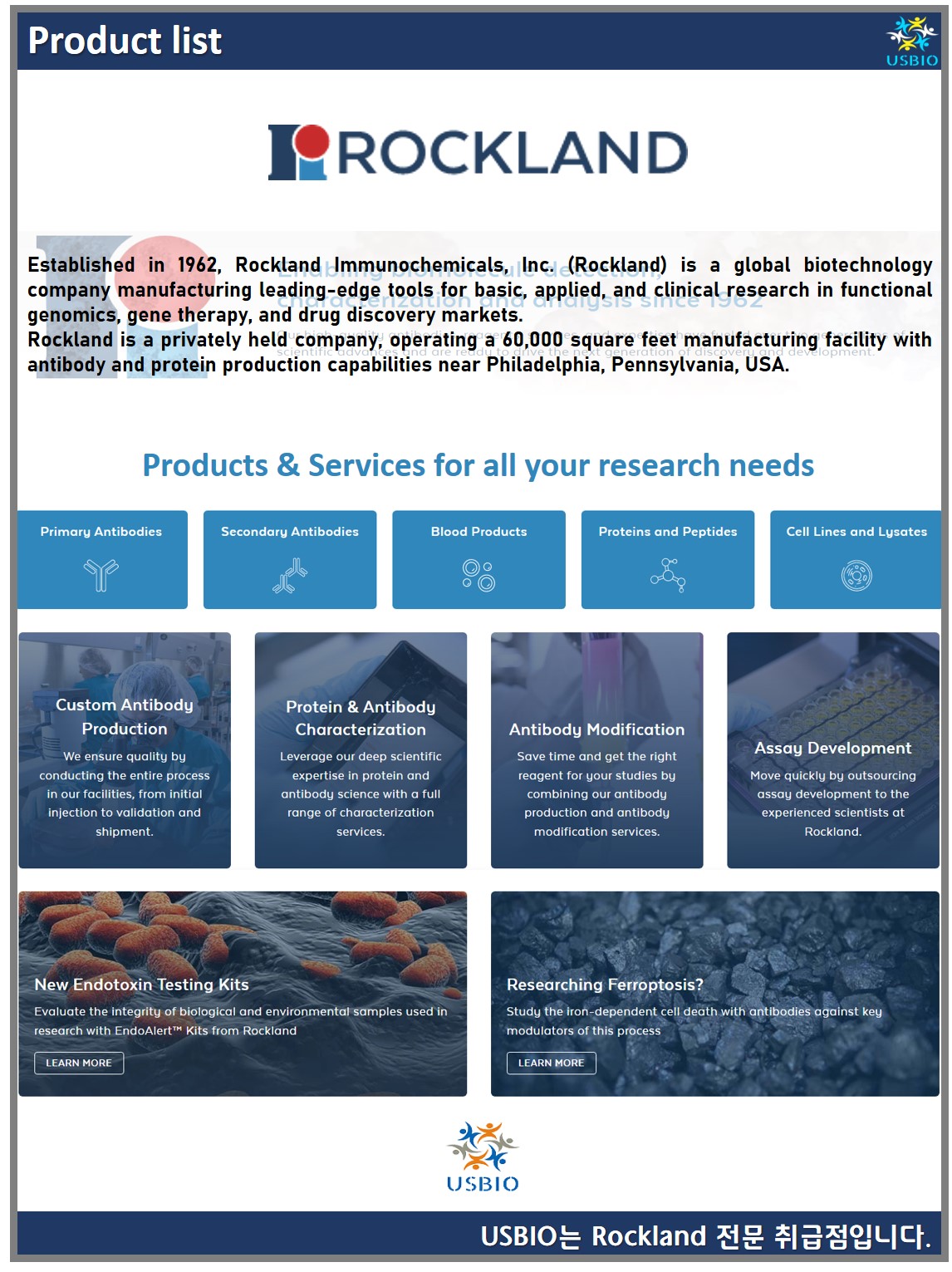 1962년에 설립된 Rockland Immunochemicals, Inc.(Rockland)는 기능 유전체학, 유전자 치료 및 약물 발견 시장에서 기초, 응용 및 임상 연구를 위한 첨단 도구를 제조하는 글로벌 생명공학 회사입니다. Rockland는 미국 펜실베니아주 필라델피아 근처에서 항체 및 단백질 생산 능력을 갖춘 60,000평방피트의 제조 시설을 운영하고 있습니다. Rockland의 주요 제품으로는 1차 항체, 2차 항체, 혈액 제제, 단백질 및 펩타이드, 시약 ,Cell Lines & Lysates, 트루블롯, 키트 등이 있으며 주요 서비스로는 맞춤형 항체 생산, 단백질 및 항체 특성화, 항체 변형, 분석 개발, 세포 배양 서비스, 단백질 발현 및 정제, 크리스퍼 서비스 등을 제공하고 있습니다.