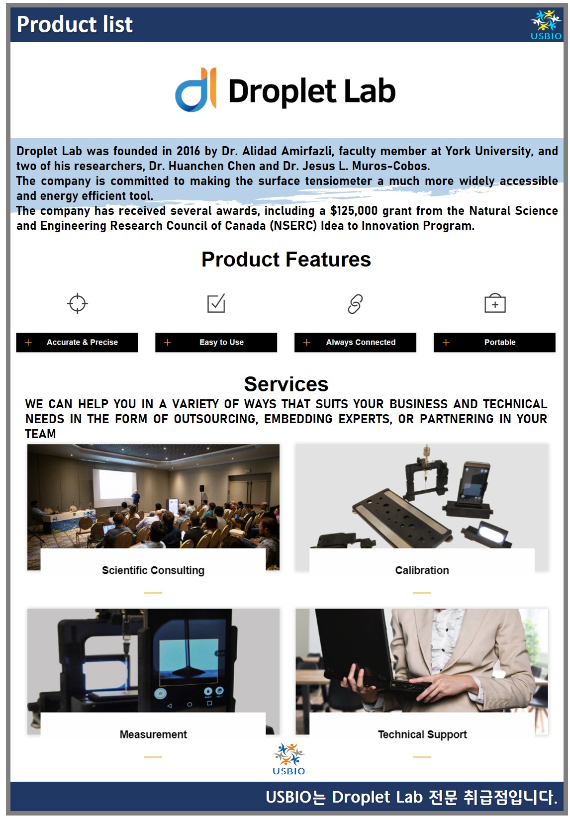 Droplet Lab은 2016년 York University의 교수인 Dr. Alidad Amirfazli와 그의 연구원 Huanchen Chen 박사와 Jesus L. Muros-Cobos 박사에 의해 설립되었으며, 이 회사는 표면 장력계를 훨씬 더 널리 사용 가능하고 에너지 효율적인 도구로 만들기 위해 최선을 다하고 있습니다. Droplet Lab의 혁신적인 스마트폰 기반 장력계는 표면 특성 측정에 편의성과 정밀성을 제공하고 있습니다. 정확한 접촉각, 표면 장력, 표면 에너지 및 슬라이딩 각도 측정을 제공하는 Droplet Lab은 연구원과 교육자에게 훨씬 더 비싸고 번거로운 과학 장비에서 볼 수 있는 기술 기능을 제공하고 있습니다.