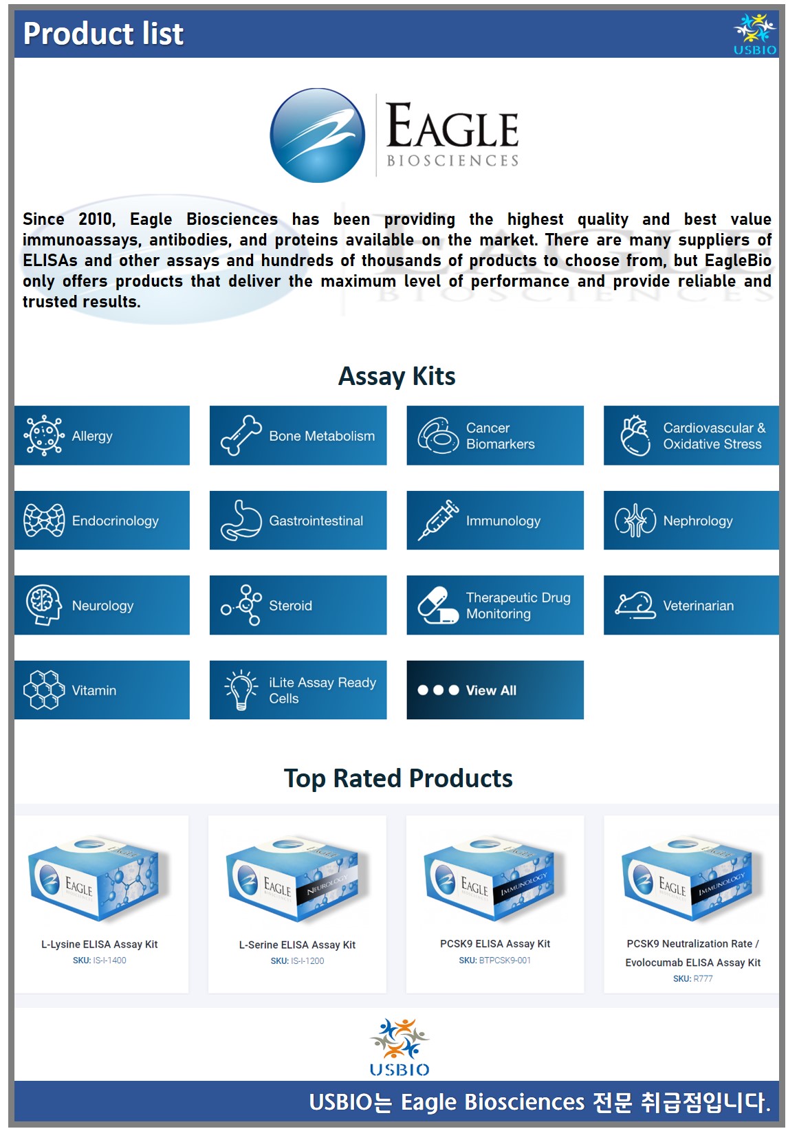 Eagle Biosciences는 2010년부터 시장에서 사용할 수 있는 최고 품질과 최고 가치의 면역분석, 항체 및 단백질을 제공하고 있습니다. ELISA 및 기타 분석 및 선택할 수 있는 수십만 개의 제품 공급업체가 많이 있지만 EagleBio는 최대 수준의 성능을 제공하고 신뢰할 수 있는 결과를 제공하는 제품만 제공하고 있습니다. Eagle Biosciences의 주요 제품 군은 ELISA 분석 키트, HPLC 분석 키트, 분자 생물학 분석, 항체 및 단백질 등이 있으며 고객들에게 최대 효울의 서비스를 제공하기 위해 노력하고 있습니다.