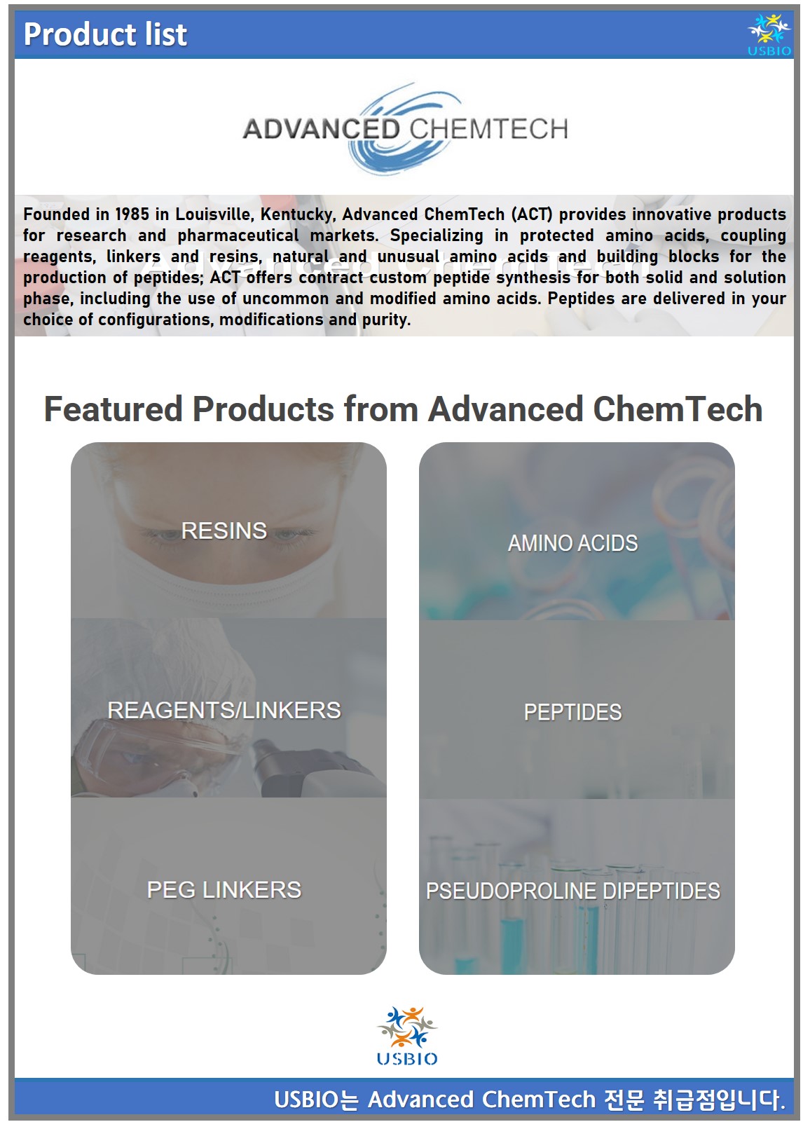 1985년 켄터키주 루이빌에 설립된 Advanced ChemTech(ACT)는 연구 및 제약 시장을 위한 정밀 화학 물질, 펩타이드 생산을 위한 원료 등 혁신적인 제품을 공급하는 회사입니다. protected amino acids, coupling reagents, 링커 및 수지, 천연 및 특이한 아미노산 및 펩타이드 생산을 위한 빌딩 블록을 전문으로 하며, ACT는 흔하지 않은 아미노산과 변형된 아미노산의 사용을 포함하여 고체상과 용액상 모두에 대한 계약 맞춤형 펩타이드 합성을 제공하고 있습니다. 그 중 펩타이드는 구성, 변형 및 순도를 선택하여 제공됩니다. Advanced ChemTech는 35,000 평방 피트 시설에 실험실, 스케일 업 플랜트, GLP 유닛 및 사무실을 보유하고 있습니다.