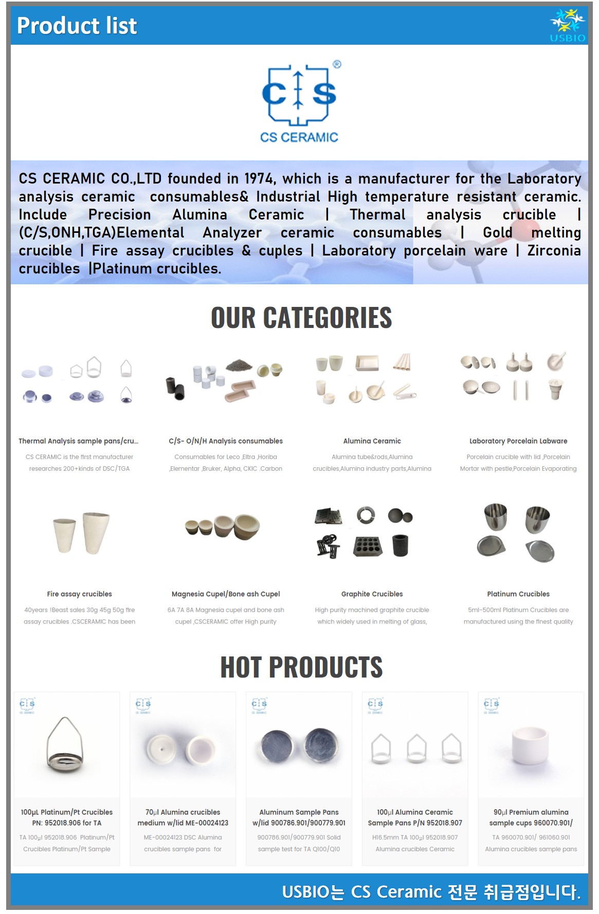CS CERAMIC은 1974년 설립된 실험 분석용 세라믹 소모품 및 산업용 고온 내성 세라믹 제조업체입니다. CS CERAMIC 제품에는 정밀 알루미나 세라믹 소모품 |열분석용 크루시블|(C/S,ONH,TGA)원소 분석기용 세라믹 소모품| 금 용해 크루시블 | 내화 실험용 크루시블 및 큐플 | 실험용 자기제 | 산화지르코늄 크루시블 |백금 크루시블 등을 포함하고 있습니다. CS CERAMIC의 제품에는 탄소-황산 분석 도가니, 황 검출 도가니, 용기 모양의 도가니가 포함되며, 모두 안정적으로 형성되고 균열과 누출도 없고 내산성,베이스 내성, 내열성을 가지고 있어 많은 고객들이 선호하고 있습니다.