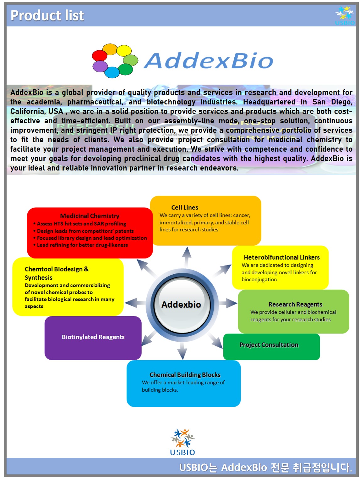 AddexBio는 학계, 제약 및 생명 공학 산업을 위한 연구 개발 분야에서 고품질 제품 및 서비스를 제공하는 글로벌 공급업체입니다. 미국 캘리포니아주 샌디에이고에 본사를 두고 있어 비용 효율적이고 시간 효율적인 서비스와 제품을 제공할 수 있는 확고한 위치에 있습니다. 또한 조립 라인 모드, 원스톱 솔루션, 지속적인 개선 및 엄격한 IP 권리 보호를 기반으로 구축되어 있어 고객의 요구에 맞는 포괄적인 서비스 포트폴리오를 제공할 수 있으며 의약화학에 대한 프로젝트 컨설팅을 제공하여 프로젝트 관리 및 실행을 용이하게 합니다.
