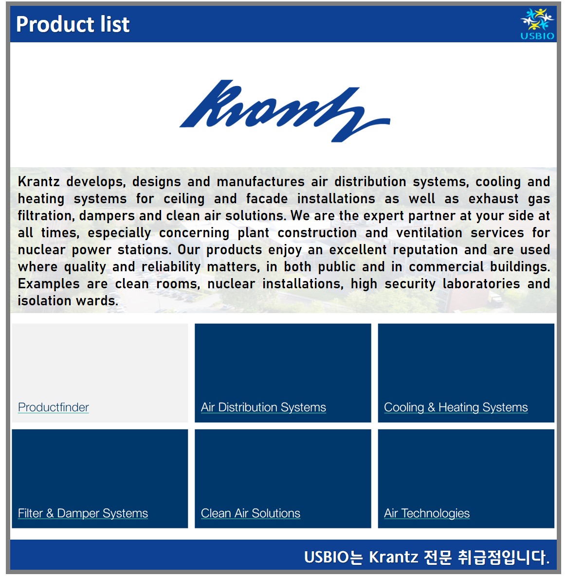 Krantz는 공기 분배 시스템, 천장 및 외관 설치를 위한 냉각 및 난방 시스템뿐만 아니라 배기가스 여과, 댐퍼 및 청정 공기 솔루션을 개발, 설계 및 제조합니다. 특히 원자력 발전소의 발전소 건설 및 환기 서비스와 관련한 믿을 수 있는 전문 파트너로 Krantz의 제품은