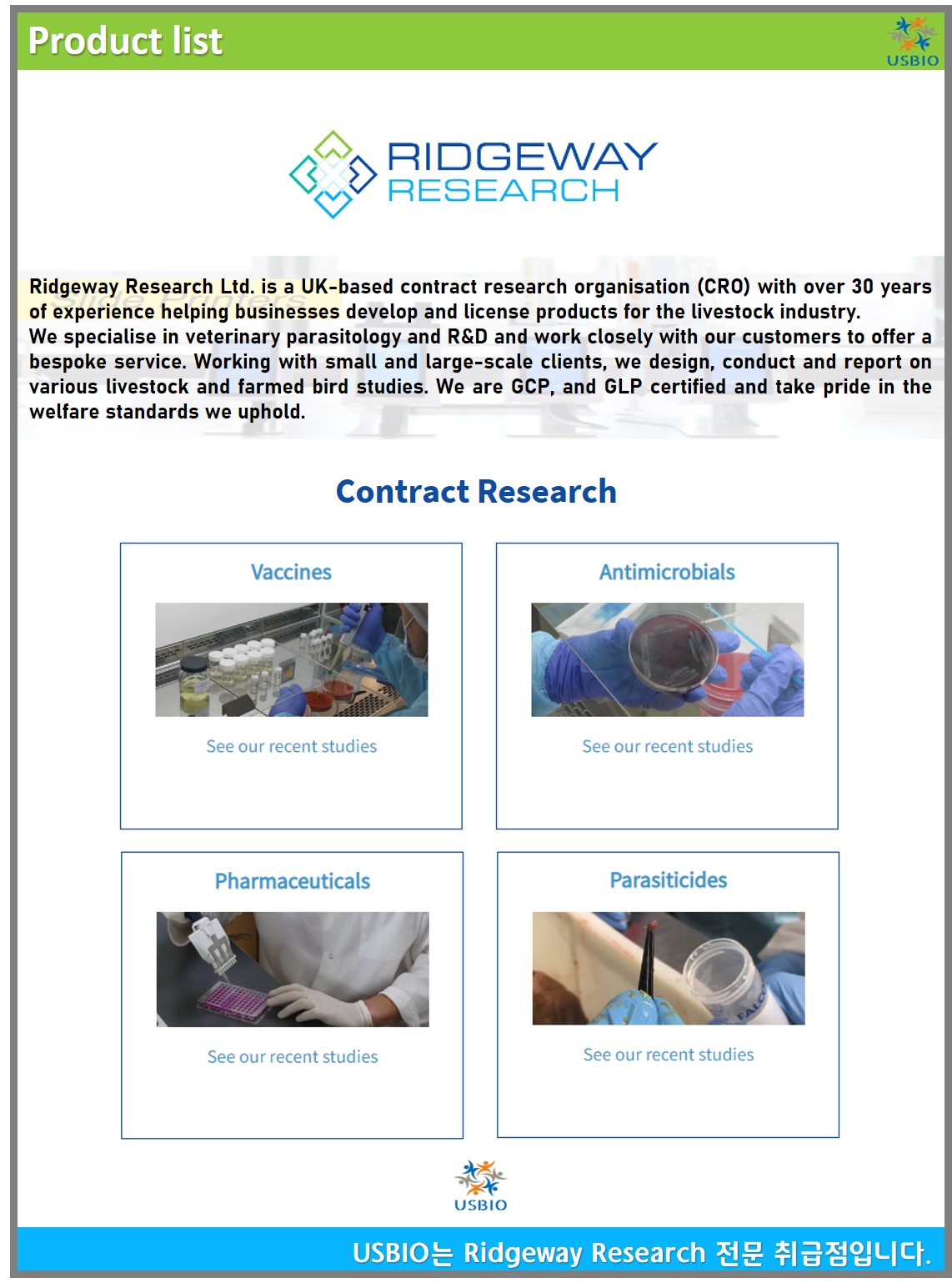 Ridgeway Research(리지웨이 리서치) 글로벌 위탁 연구 기관(CRO)으로 소, 양, 염소, 돼지, 말, 가금류 및 게임 조류를 포함한 가축 종에 대한 광범위한 연구를 제공하고 있습니다. Ridgeway Research는 150 개 이상의 연구를 수행했으며 고객 중 상위 10 대 글로벌 동물 건강 회사 중 다수를 포함하고 있습니다. Ridgeway Research 시설은 GLP 및 GCP 수준 모두에 대한 연구를 수행 할 수 있는 완전한 허가를 받았으며 일반적으로 약동학 약력학에 관한 연구를 실행하며 여기에는 일반적으로 잔류 물, 백신 (전임상 및 임상 모두), 독성 및 EFSA 지침에 따라 수행되어야하는 사료 분석이 포함됩니다. 추가로 Ridgeway는 기생충학 연구 지원을 위해 연구 기관과 대학에 다양한 기생충도 공급하고 있습니다.