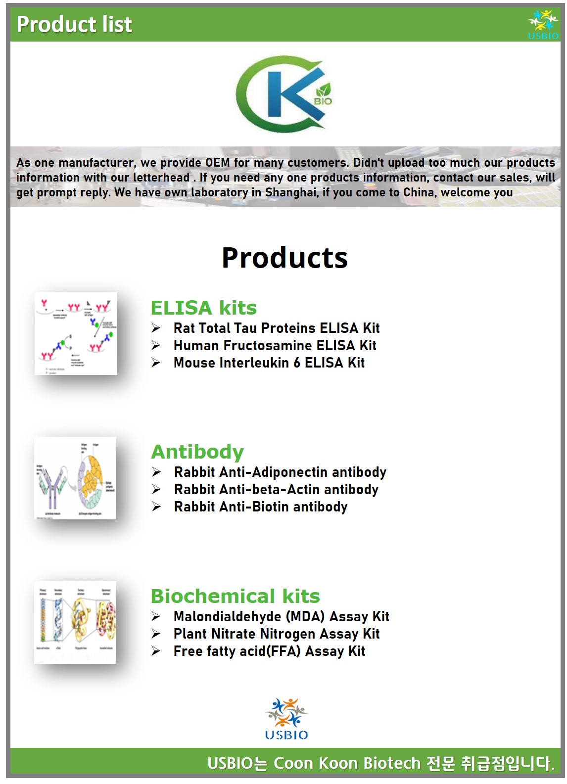 Shanghai Coon Koon Biotech는 생물학적 제품의 연구, 개발, 생산 및 관리를 전문으로 하는 하나의 종합 생물학 관련 회사입니다. 주로 ELISA kit, 생화학시약, 항체 등 수만개의 연구제품을 하고 있으며, 분자생물학, 세포생물학, 면역학 등 다양한 분야에서 활약하고 있습니다. Coon Koon Biotech 제품의 주요 카테고리에는 엘리사(ELISA), 항체(Antibody), 생화학 키트(Biochemical Kits) 등이 있으며 분자생물학, 세포생물학, 면역학과 같은 다양한 분야에 관여하고 있습니다.