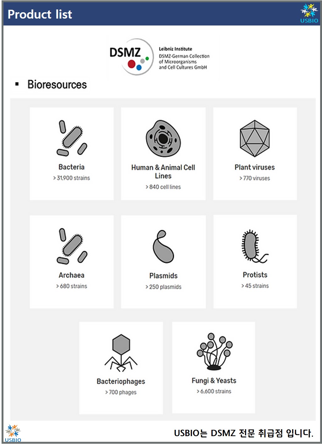 USBIO는 DSMZ의 한국 국내 수입은 물론 관련 업무를 전문적으로 수행하고 있습니다. DSMZ은 미생물 다양성에 대한 제한된 지식과 기초 연구를 위해 혁신적인 바이오 관련 기술을 기반으로 28,900종 이상의 microorganisms, 1,500종 이상의 plant viruses 및 antisera , 850 종 이상의 human and animal cell lines을 공급하고 있습니다.