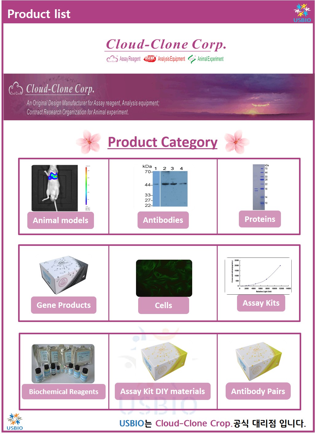 Cloud-Clone(클라우드 클론)은 휴스턴에 본사를 두고 있는 분자 생물학 및 면역학 지향 기업의 연구 및 실험 개발 회사이며 주요 사업은 분석 시약 생산, 분석 장비 제조 및 동물 실험 서비스입니다.Cloud-Clone(클라우드 클론)의 주요 사업에는 분석 시약 생산, 분석 장비 제조 및 동물 실험 서비스가 포함됩니다. 고객의 75 %가 미국과 유럽전역에 있는 연구원들입니다. Cloud-Clone(클라우드 클론)은 심오한 기술 축적과 primers, cDNAs, plasmids, hybridoma cells 및 검출 시약의 반제품을 기반으로 짧은 lead time 으로 11,000 개의 단백질, 19,000 개의 항체 및 7,000 개의 면역 분석 키트를 제공 합니다.