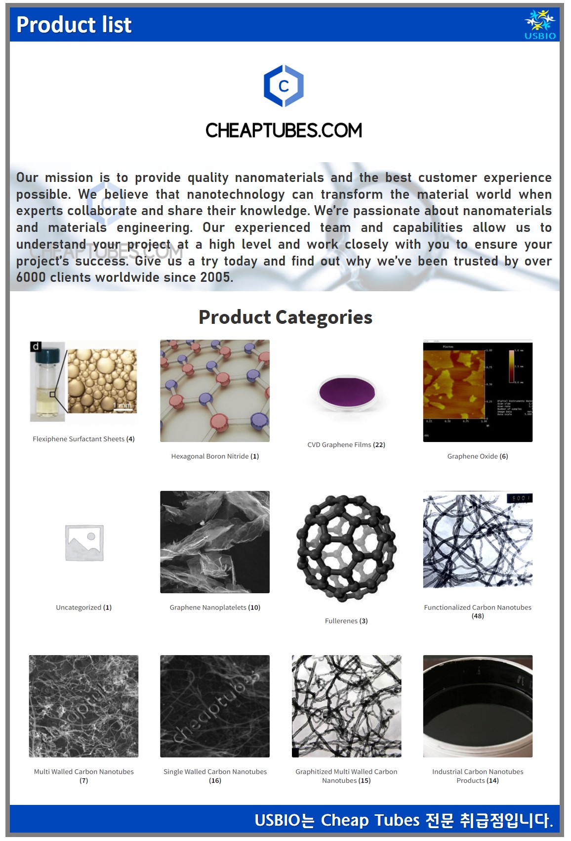 Cheap Tubes은 탄소 나노 튜브(carbon nanotube) 및 탄소 원자로 이루어진 얅은 막인 그래핀(graphene)을 공급하고 있는 업체입니다. Cheap Tubes의 제품은 대부분의 경우 그램(g) 단위이며 전도성 나노 튜브 복합재, 탄소 나노 튜브 마스터 배치, 산업용 등급 탄소 나노 튜브의 경우 킬로그램(kg) 당으로 공급하고 있습니다.Cheap Tubes의 사명은 고품질 나노물질과 가능한 최고의 고객 경험을 제공하는 것이며 그 분야의 전문가들과의 협력을 통해 나노기술로 물질 세계를 변화시키기 위해 노력하고 있습니다.