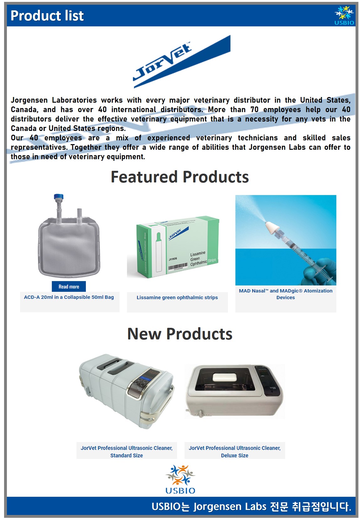 Jorgensen Laboratories는 미국과 캐나다의 모든 주요 수의학 유통업체와 협력하고 있으며 40개 이상의 국제 유통업체를 보유하고 있습니다. Jorgensen은 숙련된 수의학 기술자를 포함하여 70명 이상의 직원을 보유하고 있으며, 귀중한 기술 지원 및 숙련된 영업 담당자를 통해 수의학 유통업체와 협력하여 최고 품질의 계측기와 전 세계 동물병원에 사용할 수 있는 최고의 수의학 관련 장비를 제공하고 있습니다. Jorgensen Labs은 1970년대 초부터 최고 품질의 의료 제품을 제공해 왔으며 제품 라인을 오늘날까지 계속 확장하고 있습니다.