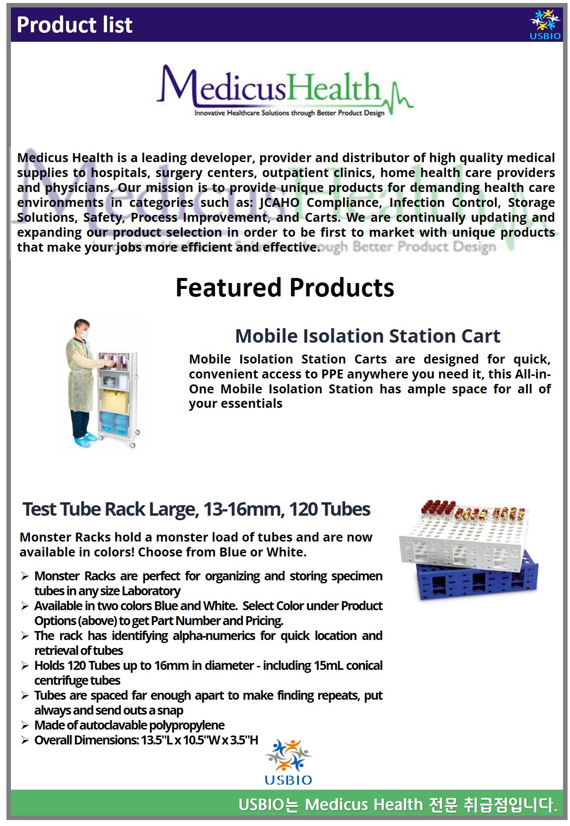 Medicus Health는 병원, 수술 센터, 외래 환자 진료소, 가정 건강 관리자 및 의료진 등에 고품질 의료 용품을 공급하는 선도적인 개발, 공급 및 유통업체입니다. Medicus Health의 제품 중에는 Infection Control, Lab Supplies, Surgical Products, IV & Blood Draw Supplies, Radiology 등 다양한 카테고리로 구성되어 있습니다. Medicus Health는 JCAHO 규정 준수, 감염 관리, 보관 솔루션, 안전, 프로세스 개선 및 카트 등의 기준을 지키면서 의료환경에서 필요한 고유한 제품을 제공하려고 노력하고 있습니다.