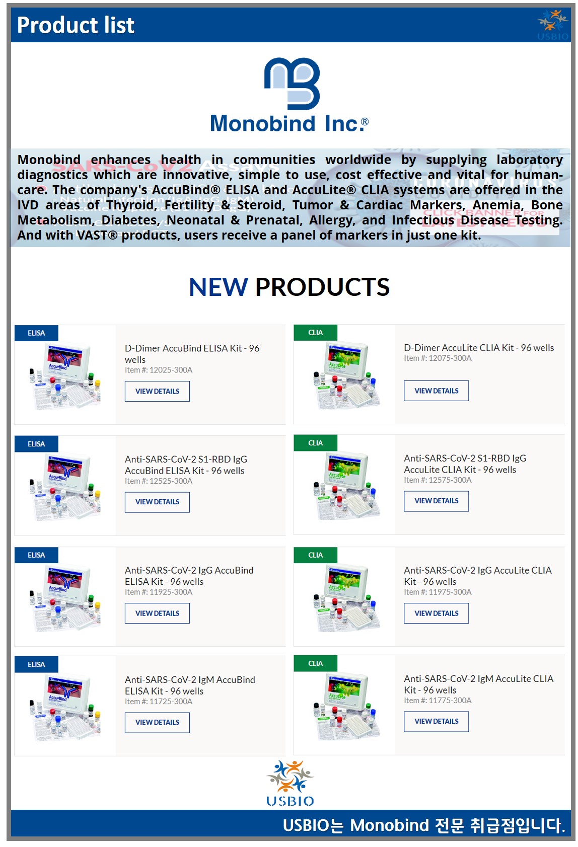 Monobind는 혁신적이고 사용이 간편하며 비용 효율적이며 인체 관리에 필수적인 실험실 진단을 제공함으로써 전세계 커뮤니티의 건강을 향상시킵니다. AccuBind® ELISA 및 AccuLite® CLIA 시스템은 갑상선, 출산 및 스테로이드, 종양 및 심장 마커, 빈혈, 뼈 대사, 당뇨병, 신생아 및 태아, 알레르기 및 감염성 질환 테스트의 IVD 영역에서 제공됩니다. 강력한 R & D 초점과 제조 우수성을 갖춘 Monobind는 지속적으로 고품질 제품을 제공하고 있습니다.