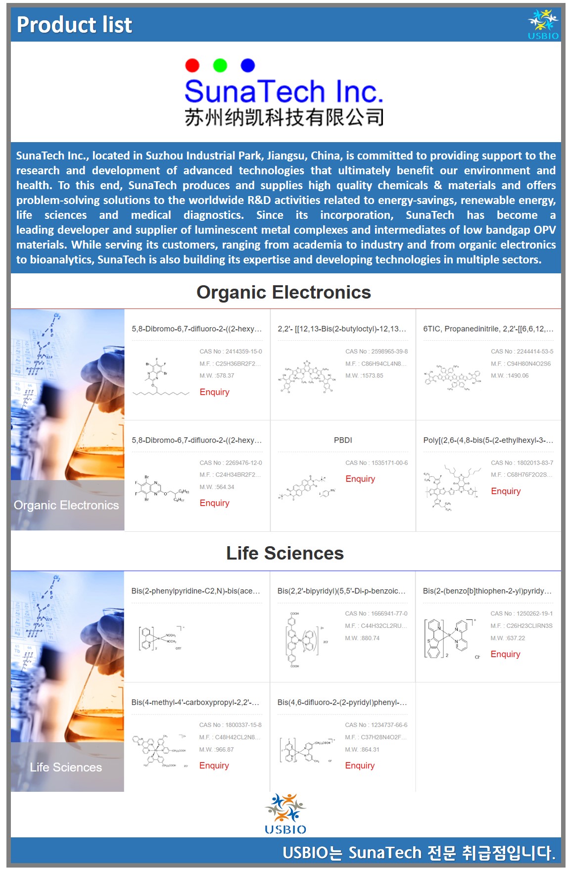 SunaTech Inc.는 궁극적으로 우리의 환경과 건강에 도움이 되는 첨단 기술의 연구 개발을 지원하기 위해 최선을 다하고 있습니다. 이를 위해 SunaTech는 고품질 화학 물질 및 재료를 생산 및 공급하고 에너지 절약, 재생 가능 에너지, 생명 과학 및 의료 진단과 관련된 전세계 R&D 활동에 문제 해결 솔루션을 제공합니다. 설립 이후 SunaTech는 발광 금속 착물 및 낮은 밴드갭 OPV 재료 중간체의 선도적인 개발 및 공급업체가 되었습니다. SunaTech는 학계에서 산업체에 이르기까지, 유기 전자에서 생물 분석에 이르기까지 고객에게 서비스를 제공하는 동시에 여러 분야에서 전문성을 구축하고 기술을 개발하고 있습니다.