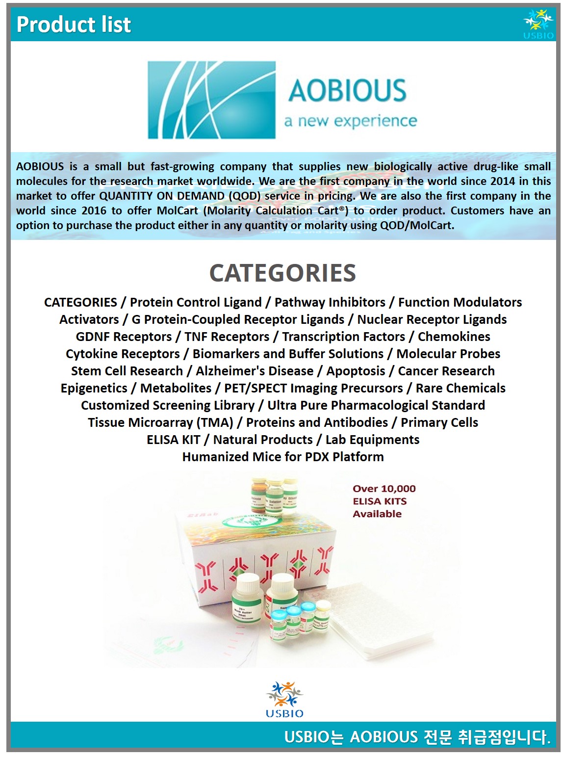 AOBIUS는 전 세계 연구 시장에 생물학적으로 활성화된 약물과 같은 작은 분자를 공급하는 작지만 빠르게 성장하는 기업입니다. AOBIUS는 2014년 이후 이 시장에서 QOD(QUATION On Demand) 서비스를 제공하는 세계 최초의 기업입니다. 또한 2016년 이후 세계 최초로 MolCart(Molarity Calculation Cart®)를 통해 제품을 주문하는 기업입니다. 고객은 QOD/MolCart를 사용하여 제품을 수량이나 몰 농도에 관계없이 구매할 수 있습니다.