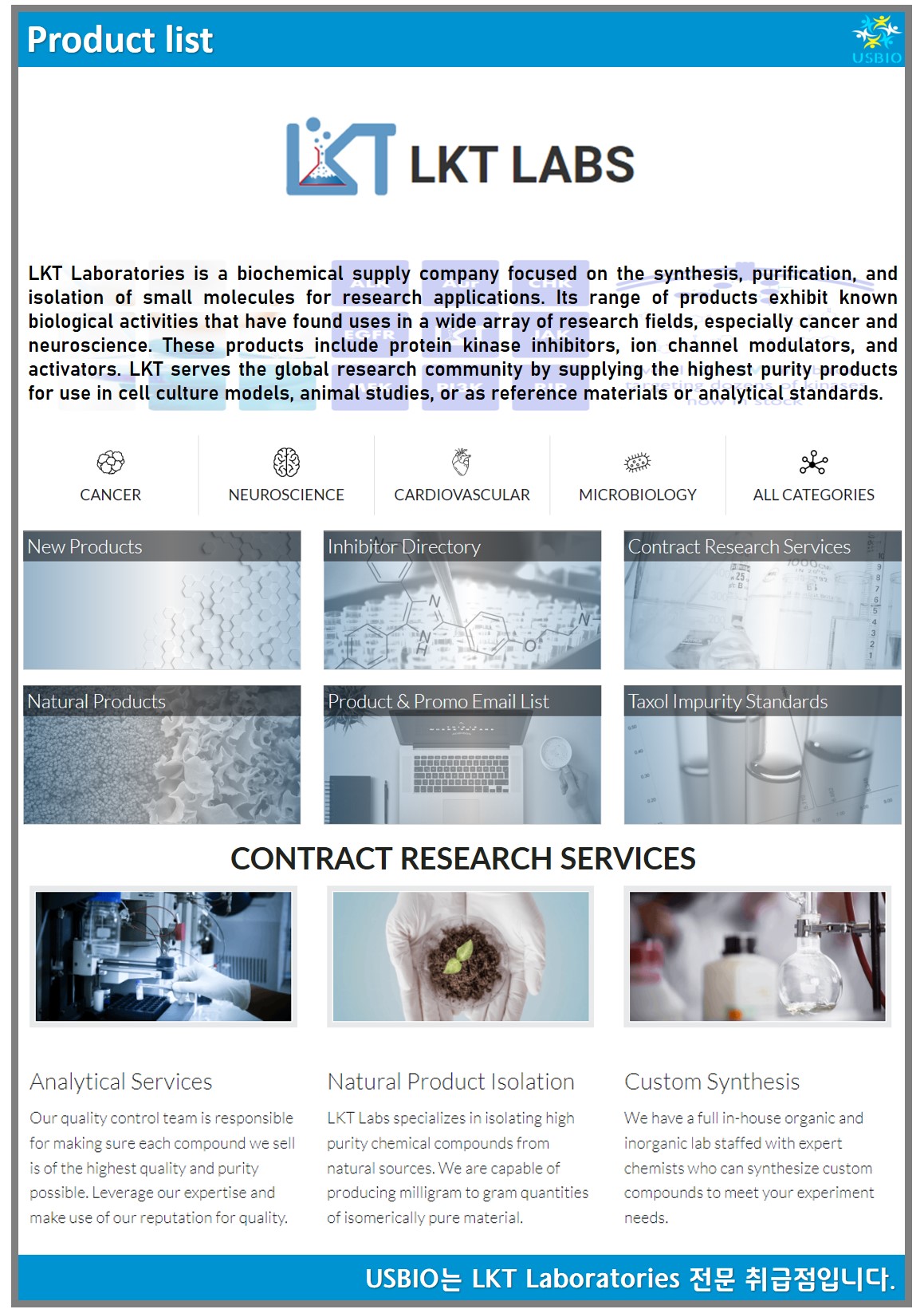 LKT Laboratories는 연구용 소분자의 합성, 정제, 분리에 초점을 맞춘 생화학 공급 회사입니다. 이 제품의 범위는 광범위한 연구 분야, 특히 암과 신경과학 분야에서 사용되는 것으로 알려진 생물학적 활동을 보여줍니다. 이러한 제품에는 단백질 키나아제 억제제, 이온 채널 조절제 및 활성제가 포함됩니다. LKT Laboratories는 세포 배양 모델, 동물 연구 또는 참조 물질 또는 분석 표준물질로 사용할 수 있는 최고 순도의 제품을 공급함으로써 글로벌 연구 커뮤니티에 서비스를 제공하고 있습니다.
