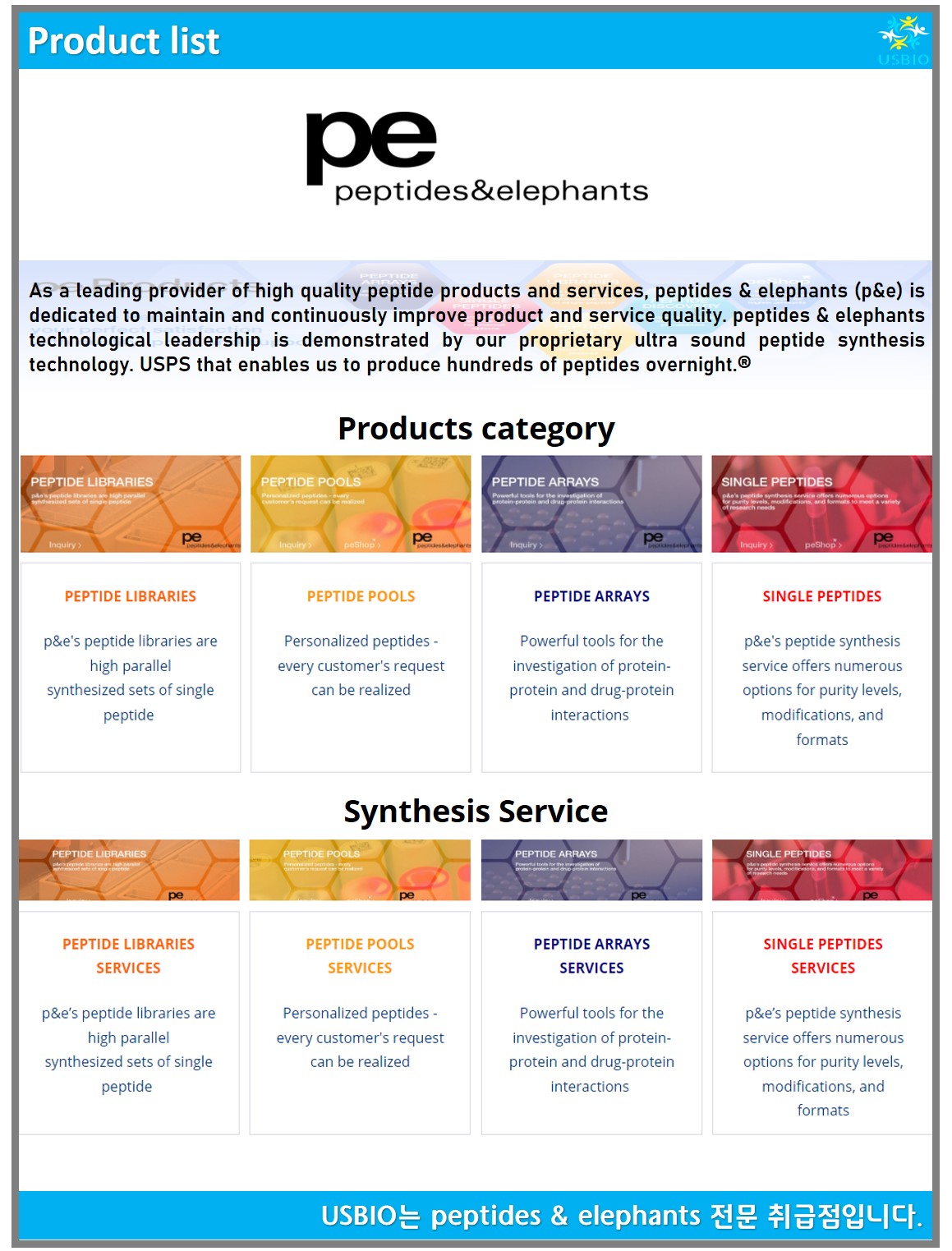 Peptides & Elephants는 펩타이드 어레이, 풀, 라이브러리 및 초음파 합성 기술 서비스를 제공하는 생명 공학 회사입니다. Peptides&Elephants의 기술적 리더십은 독점적인 울트라 사운드 펩타이드 합성 기술로 입증되었으며 USPS®를 사용하면 하룻밤 사이에 수백 개의 펩타이드를 생성할 수 있습니다. Peptides&Elephants에서 공급하고 있는 제품 카테고리는 Peptide Libraries, Peptide Pools, Peptide Arrays, Single Peptides로 구성되어 있으며 Peptide Libraries Service, Peptide Pool Service, Peptide Arrays Service, Single Peptide Synthesis Service 등의 합성 서비스를 제공하고 있습니다.