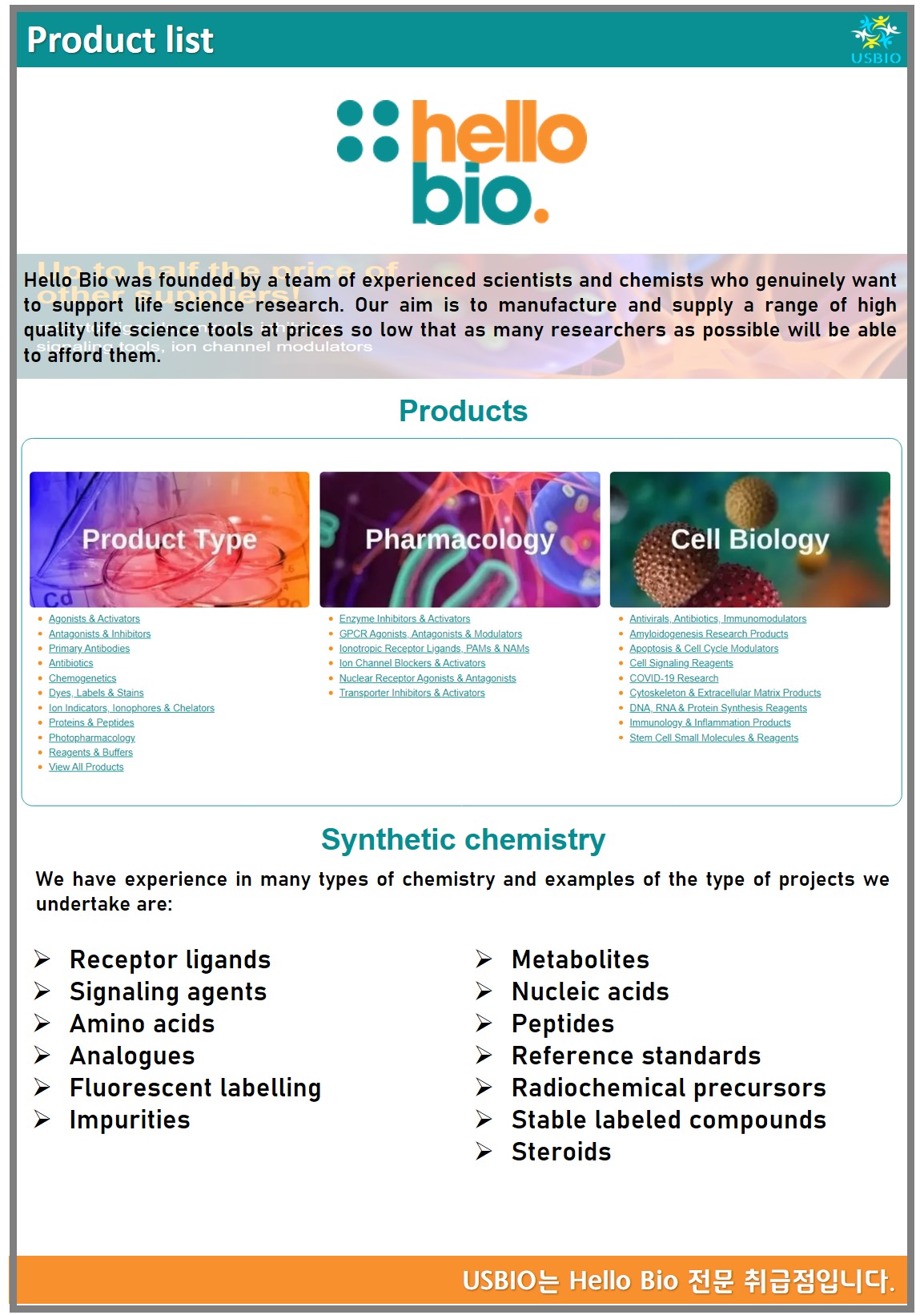 Hello Bio는 생명 공학 회사로 생명 과학에 필요한 다양한 작용제, 길항제, 억제제, 활성제, 항체 및 형광 도구를 제공하고 있으며 Hello Bio의 주요 제품으로는 효소 억제제 및 활성화제, 크리스퍼 / 유전자 편집 제품, 화학 유전 및 DREADD, 세포 생물학 제품, 염료, 라벨 및 얼룩, 이온 채널 변조기, GPCR 리간드, 줄기 세포 조절제, 시약 및 완충액 등이 있습니다. Hello Bio는 가능한 한 많은 연구자들이 이를 감당할 수 있을 만큼 저렴한 가격으로 다양한 고품질 생명 과학 도구를 제조 및 공급하기 위해 노력하고 있습니다.