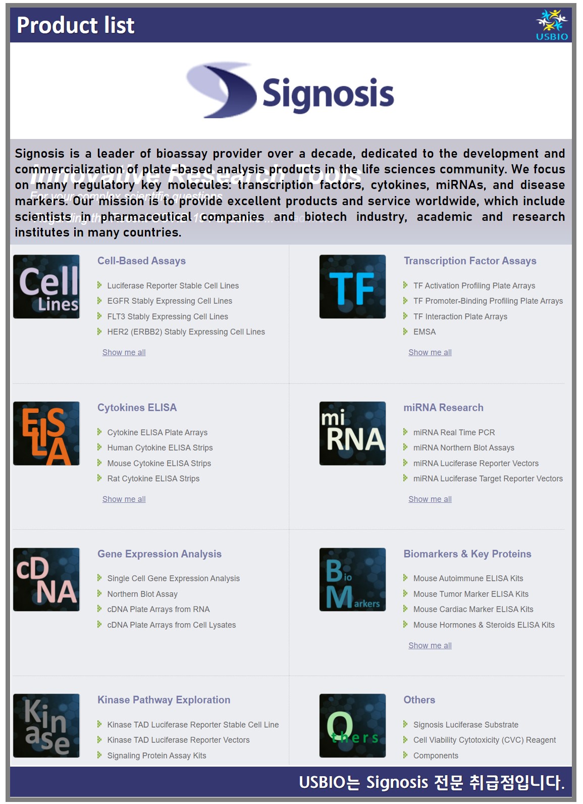 Signosis는 10년 이상 생명과학 커뮤니티에서 플레이트 기반 분석 제품의 개발 및 상용화에 전념해 온 생물학적 분석 제공업체의 선두주자입니다. Signosis는 전사 인자, 사이토카인, miRNA 및 질병 마커와 같은 많은 조절 핵심 분자에 초점을 맞추고 있으며 연구 프로젝트를 용이하게 하기 위해 맞춤형 안정 세포주를 생성하는 맞춤형 서비스를 제공하고 있습니다. Signosis에서 공급하고 있는 제품 카테고리로는 Cell-Based Assays, Transcription Factor Assays, Cytokines ELISA, Gene Expression Analysis, Biomarkers & Key Proteins 등이 있으며 Signosis는 제약 회사 및 생명 공학 산업, 학술 및 연구 기관의 과학자를 포함하여 전 세계적으로 우수한 제품과 서비스를 제공하기 위해 노력하고 있습니다.
