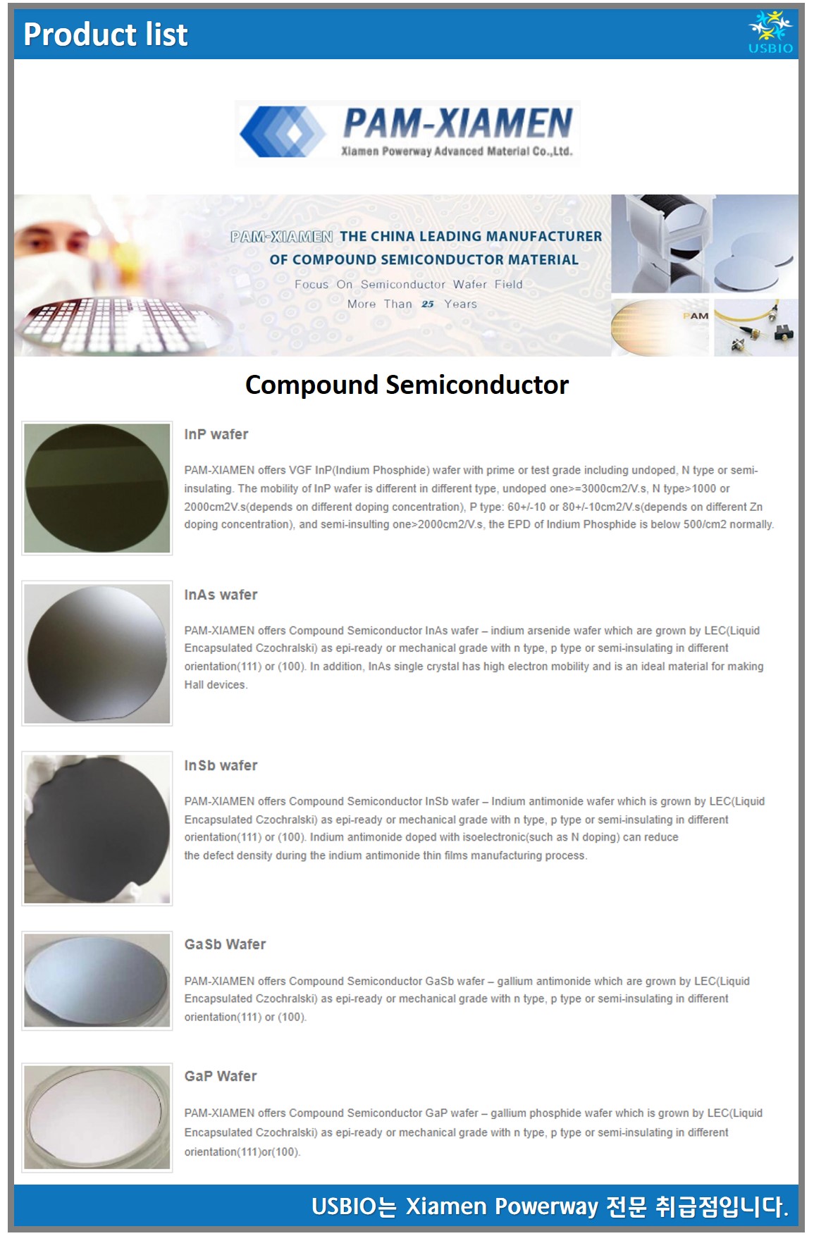 1990년 Xiamen Powerway Advanced Material(PAM-XIAMEN)을 출범시킨 것을 시작으로, 현재는 중국에서 화합물 반도체 소재의 선두 제조업체입니다. PAM-XIAMEN은 1세대 게르마늄 웨이퍼, 기판 성장을 수반하는 2세대 갈륨 비소화물 및 MBE 또는 MOCVD에 의해 성장된 Ga, Al, In, As, P를 기반으로 III-V 실리콘 도핑된 n형 반도체 재료에서 에피택시에 이르는 첨단 결정 성장 및 에피택시 기술을 개발합니다. 실리콘 탄화물 및 갈륨 질화물이 LED 및 전력 장치 용도로 사용됩니다.