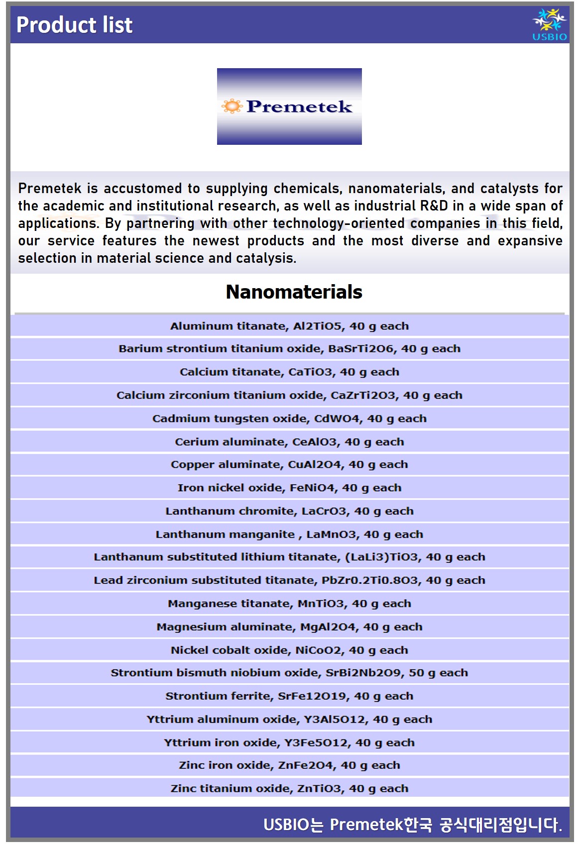 Premetek은 광범위한 응용 분야에서 산업 R&D뿐만 아니라 학술 및 기관 연구를 위한 화학 물질, 나노 물질 및 촉매 공급을 전문으로 합니다. Premetek는 복잡한 조성과 정확한 입자 크기, 입자 크기 분포 및 맞춤형 표면 특성을 나타내는 나노 물질의 독특한 제품을 제공하며 이러한 나노 물질은 코팅, 자동차, 섬유, 전자 및 특수 화학 산업 분야에 적용될 수 있습니다. Premetek가 공급하는 제품 중 특히 균질 및 이종 귀금속 촉매는 석유 화학, 연료 전지 및 제약 산업의 연구 분야에서 널리 사용되고 있습니다. Premetek는 친절한 서비스로 광범위한 프리미엄 제품을 제공하기 위해 노력하고 있습니다.