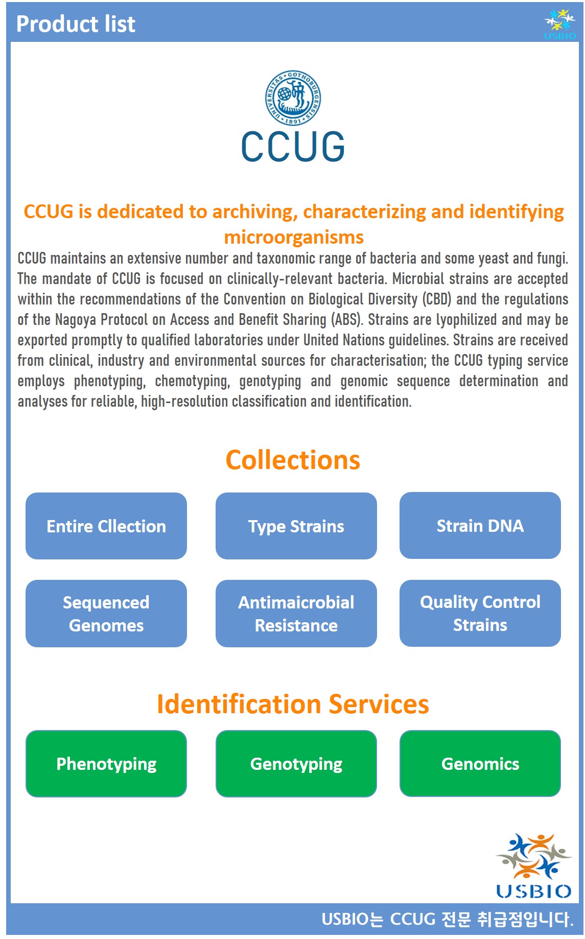 CCUG(문화 컬렉션 예테보리 대학교)는 Enevold Falsen이 설립 한 스웨덴 (예테보리)에 위치한 미생물 배양 저장소입니다. CCUG는 병원성 및 기타 임상 관련 세균의 가장 큰 컬렉션 중 하나를 보유하고 있는 것 외에도 연구 그룹으로서 활발히 활동하고 있습니다. CCUG 연구 그룹은 광범위한 미생물 보유와 체계적인 분석에 대한 전문 지식을 활용하여 국내외 프로젝트에 참여하고 있습니다.