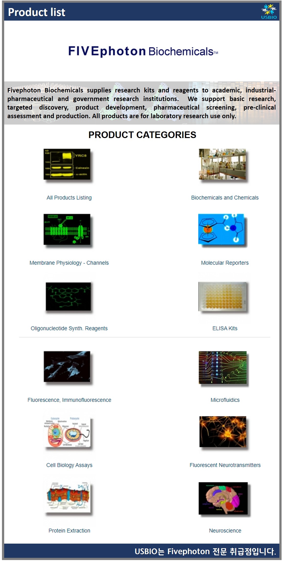 Fivephoton Biochemicals은 학술, 산업 의약품 및 정부 연구 기관에 연구 키트 및 시약을 공급하고 있으며 기초 연구, 표적 발견, 제품 개발, 제약 심사, 임상 전 평가 및 생산을 지원하고 있습니다. Fivephoton의 제품 카테고리로는 Biochemicals and Chemicals, Fluorescence, Immunofluorescence, Microfluidics, Membrane Physiology( Channels), Molecular Reporters, Cell Biology Assays, Fluorescent Neurotransmitters, Oligonucleotide Synth. Reagents, ELISA Kits, Protein Extraction, Neuroscience등이 있으며 간략하게 면역 형광 표지 키트, 면역 분석, ELISA 키트, 세포 신호 검출 키트, 전사 인자 활성화 분석, 분자 리포터, 전기 화학 바이오 센서, 단백질 추출 시약, DNA 분리 키트, 형질 주입 시약 및 형광 리간드 등을 공급하고 있습니다.