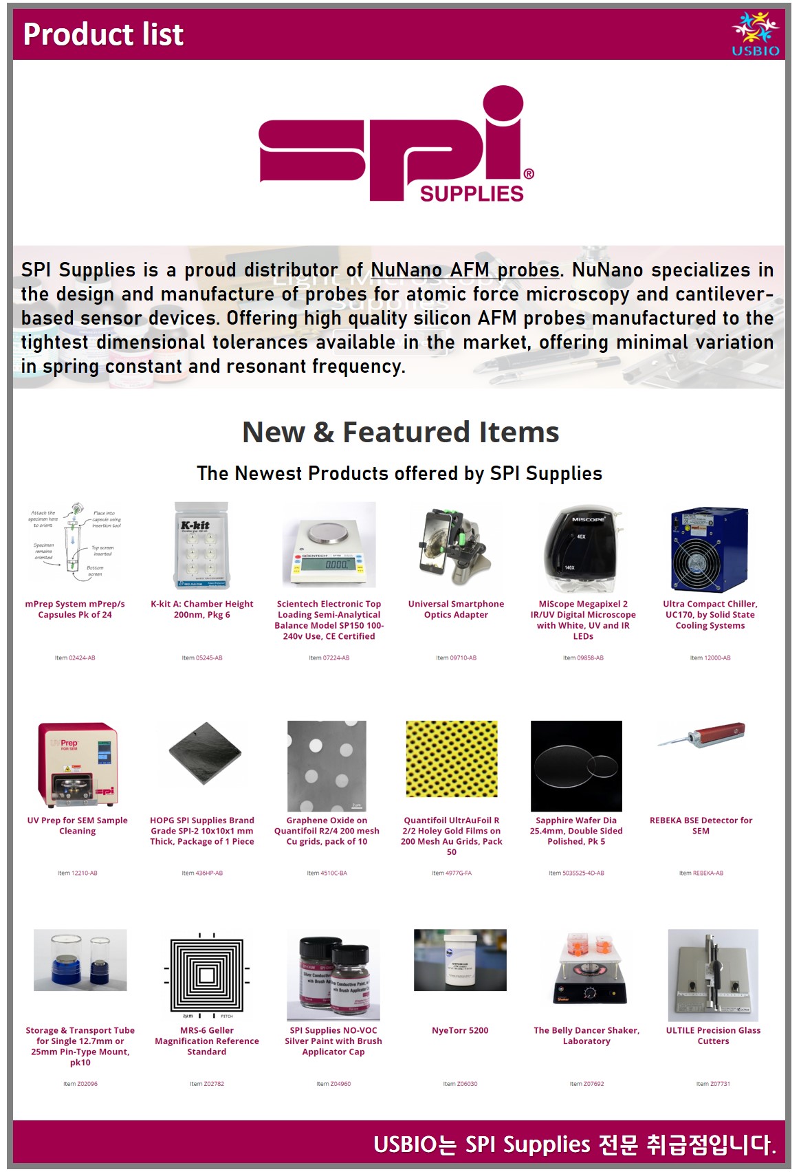 SPI Supplies는 일반적인 SEM(주사전자현미경), TEM(투과전자현미경), LM(광학현미경), SPM(주사탐침현미경) 및 표면 분석 실험실의 일상적인 작동을 위한 샘플 준비 장비 및 소모품 공급 품목의 선도적인 제조ㆍ공급 업체입니다. SPI Supplies는 이외에 현미경으로 측정한 치수 및 조성 측정을 검증하고 모니터링하기 위한 광범위한 교정 도구와 Tweezers, SEM Mounts, Small Tools, Chemicals, General Lab, Nanomaterials 등의 다양한 제품들을 공급하고 있으며 분석 서비스, 실험실 서비스 등의 서비스도 제공하고 있습니다.