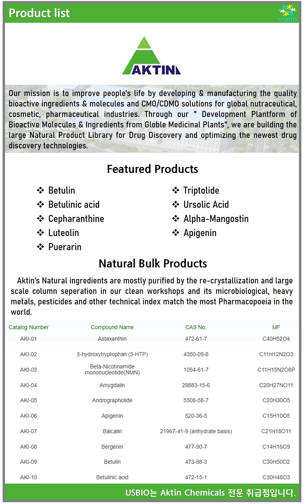 Aktin Chemicals는 화합물 및 중간체 제조업체로 글로벌 기능 식품, 화장품, 제약 산업을 위한 고품질 생리 활성 성분, 분자 및 CMO/CDMO 솔루션을 개발 및 제조하고 있습니다. Aktin Chemicals는 지구 약용 식물의 생리 활성 분자 및 성분 개발 플랜트를 통해 신약 개발을 위한 대규모 천연 제품 라이브러리를 구축하고 최신 신약 개발 기술을 최적화하고 있습니다. 또한 현대적이고 스마트한 비GMP 및 GMP 가이드라인 공장을 통해 고품질의 핵심 성분 및 분자, 중간체 및 API를 저렴한 비용으로 대량 생산하여 고객의 품질 및 예산 요구에 부응합니다. Aktin Chemicals의 천연 성분은 대부분 청정 작업장에서 재결정화 및 대규모 컬럼 분리를 통해 정제되며 미생물학, 중금속, 살충제 및 기타 기술 지표는 세계에서 가장 많은 약전과 일치합니다.