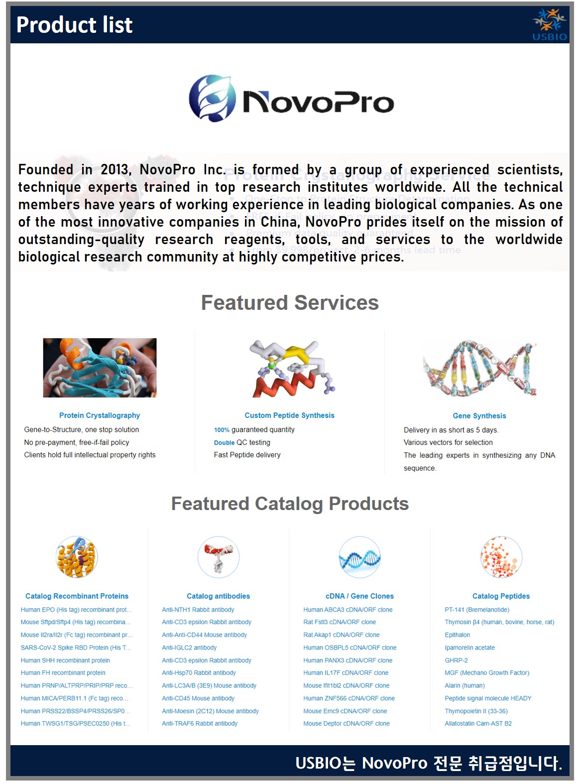 NovoPro은 창조성과 완전한 헌신으로 생물학의 황금시대에 단백질 연구를 위한 가장 가치 있는 도구와 해결책을 제공하고 있습니다. 2013년에 설립된 NovoPro는 전 세계 최고의 연구 기관에서 교육을 받은 숙련된 기술 전문가인 숙련된 과학자 그룹에 의해 설립되었습니다. 모든 기술 구성원들은 선도적인 생물학 회사에서 수년간 근무한 경험이 있습니다. 중국에서 가장 혁신적인 기업 중 하나인 NovoPro는 우수한 품질의 연구 시약, 도구 및 서비스를 매우 경쟁력 있는 가격으로 전 세계 생물 연구 커뮤니티에 제공하고 있습니다.