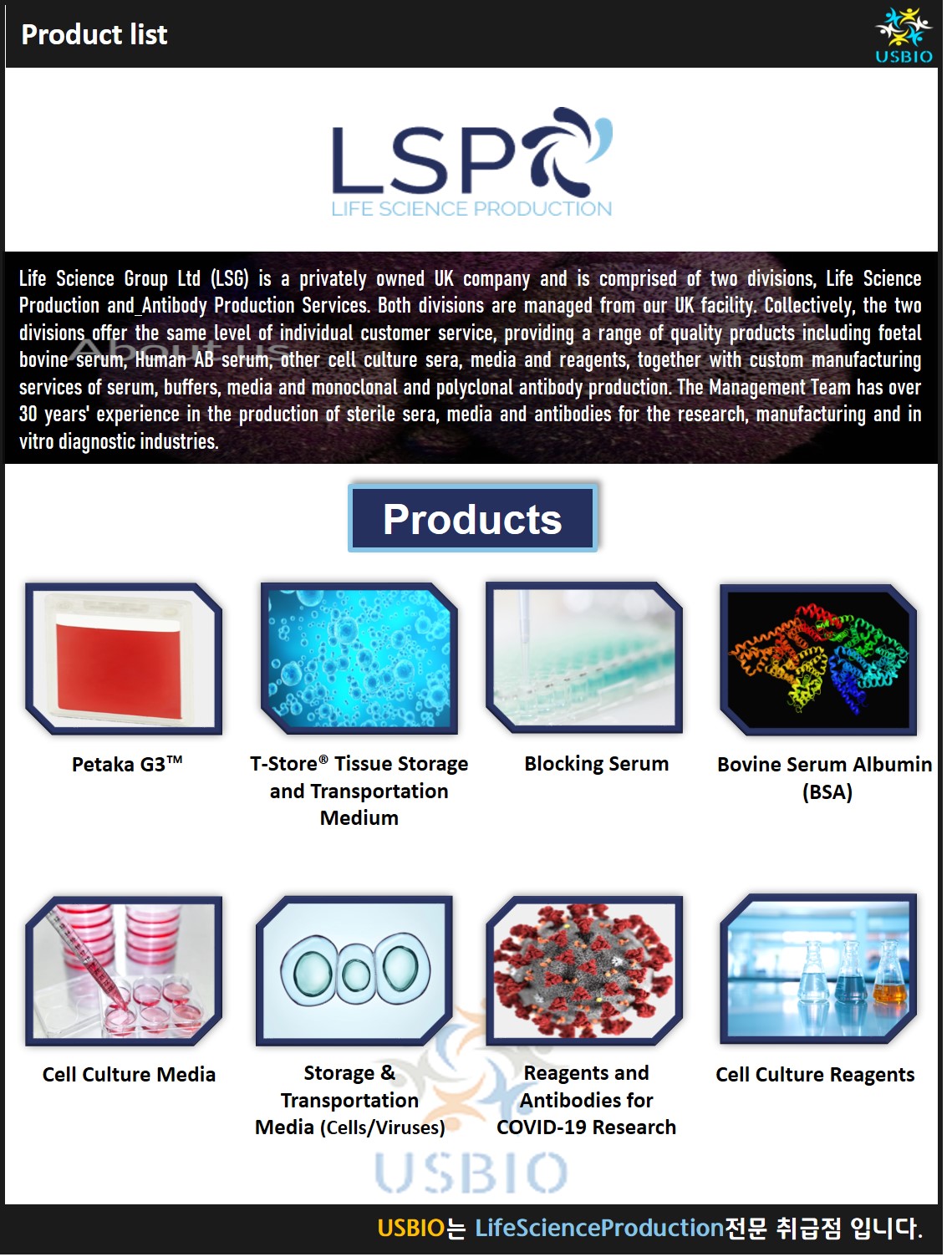 LSG(Life Science Group Ltd, LSG)는 영국의 생명과학 연구 솔루션 공급업체입니다. LSG에는 생명 과학 생산(LSP), 항체 생산 서비스(APS) 및진단 키트 서비스(DKS)의 세 부문이 있으며, 전 세계의 선도적인 제약, 생명공학, 계약 연구 기관 및 대학에 양질의 제품과 일류 고객 서비스를 제공하고 있습니다. Life Science Production(LSP)는 ISO 13485, ISO 9001:2015 및 ISIA 추적성 인증을 받았습니다. 주요 제품 카테고리로는 Animal Products, chromosome, antigen, cell culture, general lab products, human products, Reagents and Antibodies for COVID-19 Research 등이 있습니다.