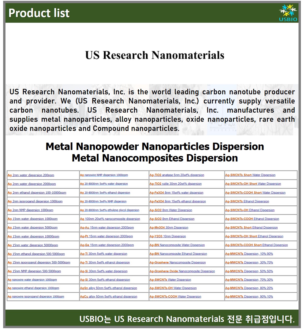 다수의 대리점을 보유하고 있는 어스바이오는 US Research Nanomaterials 전문 취급점입니다.