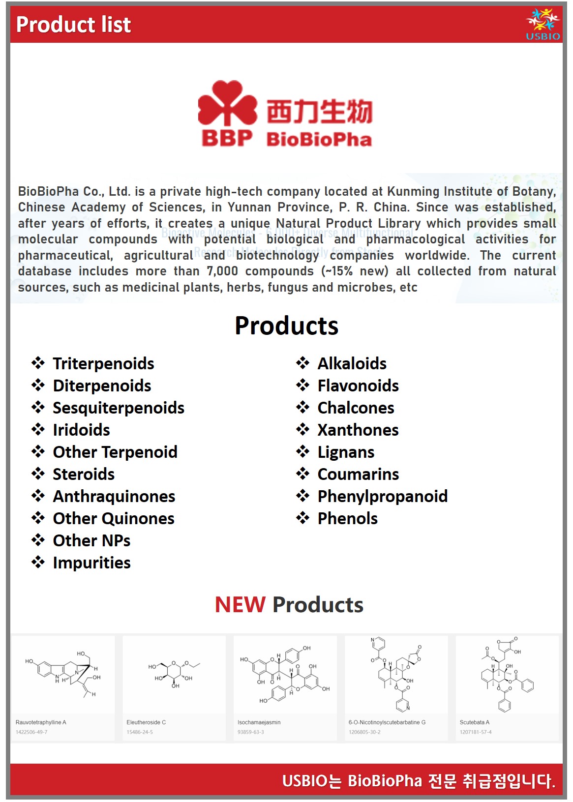 바이오바이오파(BioBioPha Co., Ltd.)는 중화인민공화국 윈난성에 있는 중국과학원 쿤밍 식물학연구소에 위치한 민간 첨단 기술 기업입니다. 바이오바이오파(BioBioPha Co., Ltd.)는 설립된 이후 수년간의 노력 끝에 전 세계 제약, 농업 및 생명공학 회사들에게 잠재적인 생물학적 및 약리학적 활동을 제공하는 독특한 천연물 라이브러리를 만들었으며 현재 바이오바이오파(BioBioPha Co., Ltd.)의 데이터베이스에는 약용 식물, 허브, 곰팡이, 미생물 등과 같은 자연 자원에서 수집된 7,000개 이상의 화합물(~15%의 새로운 화합물)이 포함되어 있습니다.