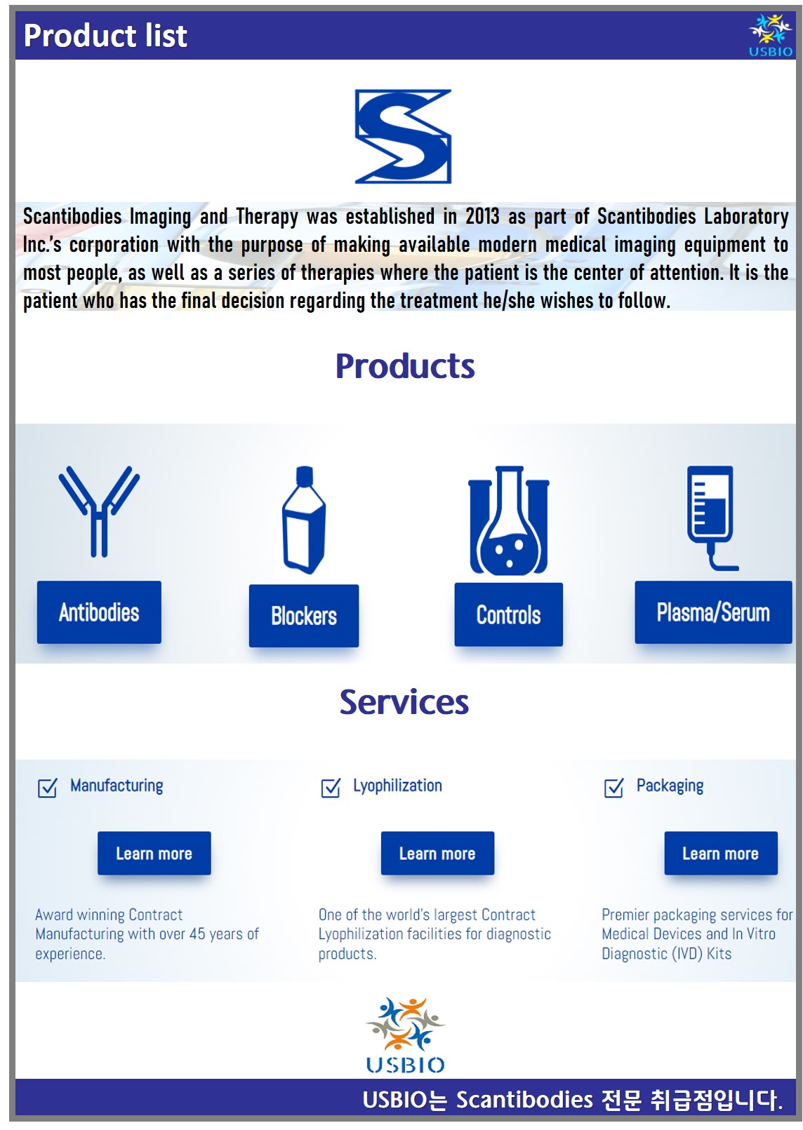 Scantibodies laboratory는 폴리클로날 및 모노클로날 항체의 제조 및 정제에 대한 40년 이상의 경험을 가지고 있으며 HBR을 포함한 항체, 대조군, 혈장 및 진단 키트, 차단제 생산을 전문으로하는 체외 진단 회사입니다. Scantibodies의 벌크 부서는 고품질 인간 및 동물 혈청 생산을 전문으로 하며 벌크 부서는 거의 모든 요구를 충족시키기 위해 맞춤형 혈청을 생산할 수 있습니다. Scantibodies에서 공급하고 있는 제품 카테고리는 Antibodies, Blockers, Controls, Plasma/Serum 등이 있으며, Manufacturing, Lyophilization 등의 서비스도 제공하고 있습니다.