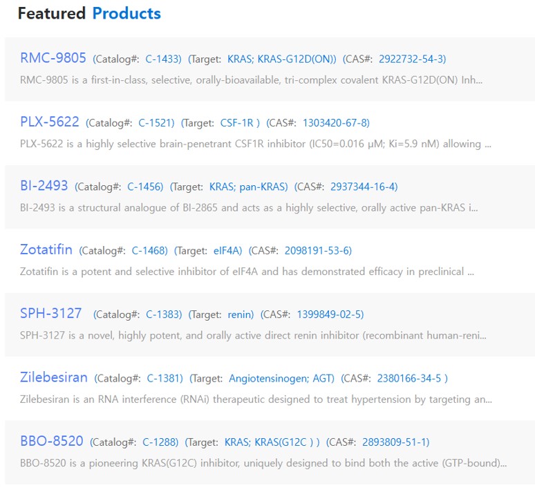 Chemgood는 세계 최고의 공급업체로, 실험실 연구를 위한 최신, 가장 시급하고 고품질의 소분자 항암제 및 키나제 억제제를 제공하는데 전념하고 있습니다. Chemgood는 합성된 항암제의 엄청난 카탈로그를 보유하고 있으며 비용 효율적이고 시간 효율적인 맞춤형 합성과 CRO 서비스(예: 체외 및 생체 내 약리학 연구, PK)를 제공하고 있습니다. Chemgood에서 공급하고 있는 모든 제품은 실험실 연구 전용입니다. Chemgood은 경쟁력 있는 가격으로 실험실 연구를 위한 고품질 소분자 함앙제를 제공하기 위해 최선을 다하고 있습니다.