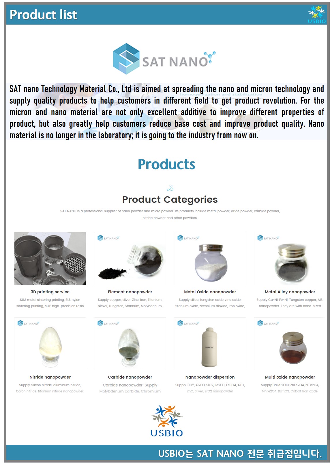 SAT nano Technology Material Co., Ltd는 나노 및 마이크론 기술을 전파하고 다양한 분야의 고객이 제품 혁명을 얻을 수 있도록 고품질 제품을 공급하는 것을 목표로합니다. 마이크론과 나노 소재는 제품의 다양한 특성을 개선하기 위한 우수한 첨가제일 뿐만 아니라 고객이 기본 비용을 절감하고 제품 품질을 개선하는 데 큰 도움이 됩니다. SAT NANO의 주요 제품은 Aluminum 나노 입자, Boron 나노 입자, Copper 나노 입자, Nickel 나노 입자,Silver 나노 입자, Tungsten 나노 입자와 같은 요소입니다.