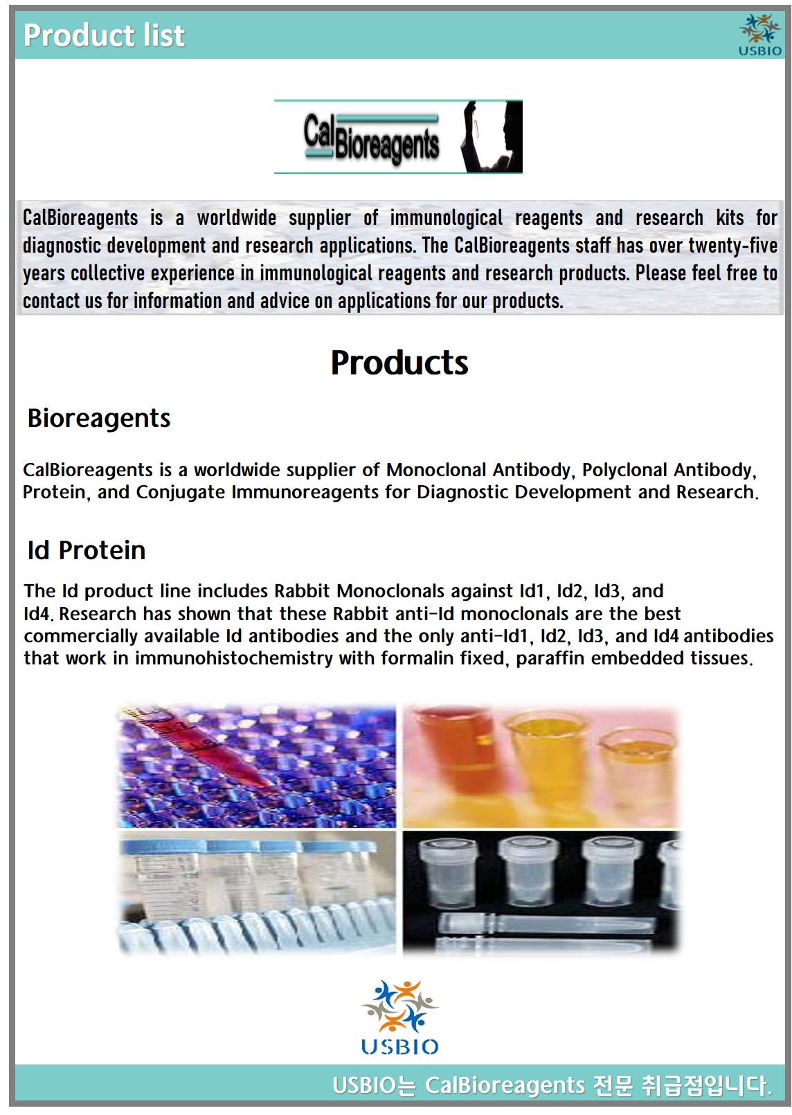 CalBioreagents는 진단 개발 및 연구 응용 분야를 위한 면역학적 시약 및 연구 키트의 세계적인 공급업체입니다. CalBioreagents의 면역시약 제품에는 단클론 항체, 다클론 항체, 접합체 및 정제 단백질이 포함되며, 시약은 면역 분석 개발, 진단 키트 제조, 웨스턴 블롯, 면역 침전 및 면역 조직 화학을 포함한 광범위한 응용 분야에 적합합니다. CalBioreagents의 Id Proteins 제품 라인에는 Id1, Id2, Id3 및 Id4에 대한 Rabbit Monoclonal Antibodies(토끼 단일 클론)이 포함되며 Id Proteins은 bHLH(기본 나선-루프-나선) 단백질로 알려진 전사 인자 그룹과의 물리적 상호 작용을 통해 전사의 음성 조절자 역할을 하고 유전자 발현, 세포 증식, 종양 형성 및 혈관 신생을 조정하는데 중심적인 역할을 할 수 있습니다.