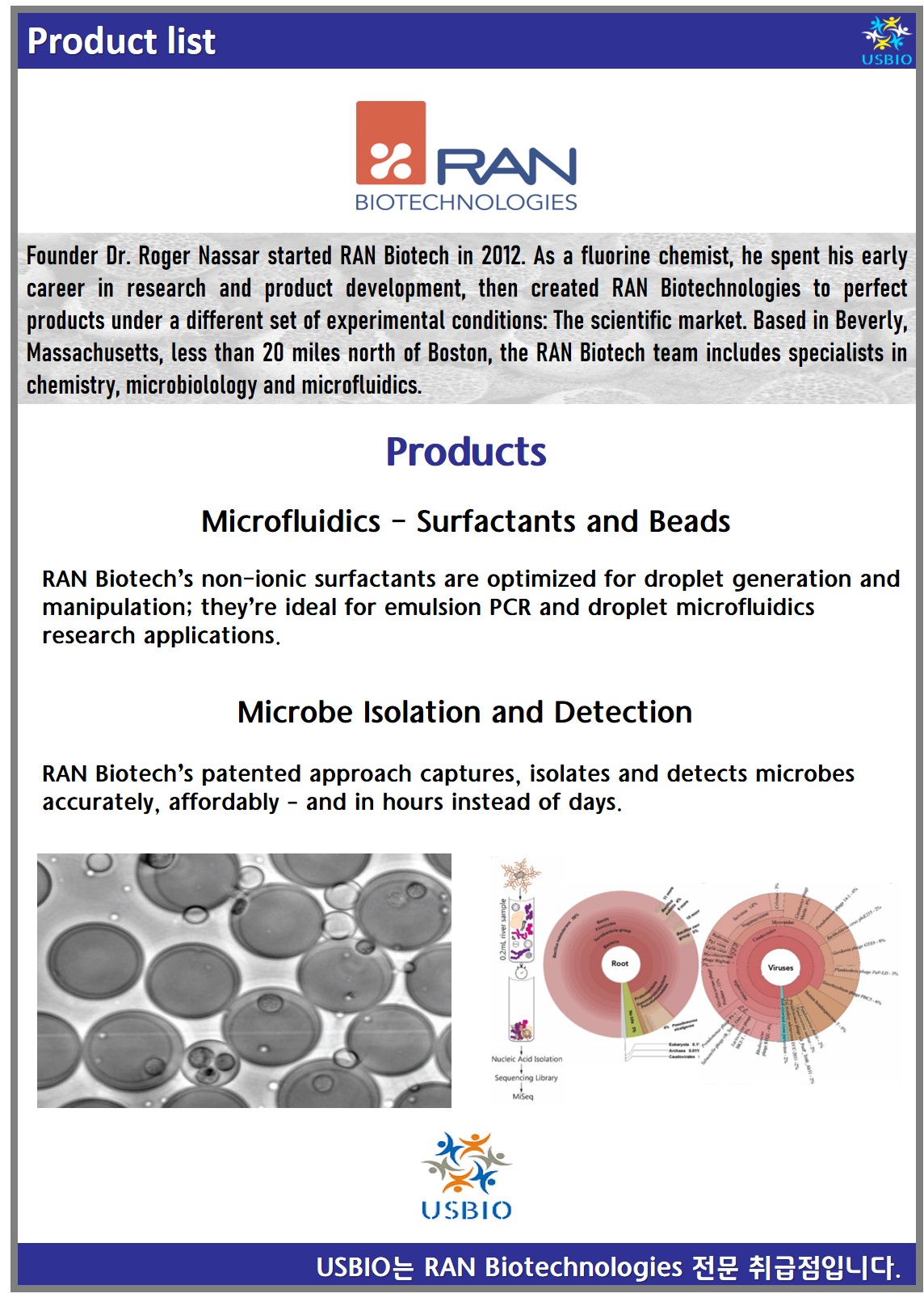 RAN Biotechnologies Inc는 차세대 과학을 위한 스마트한 재료 및 화학 제품을 공급하는 회사로 고품질의 마이크로 및 나노 재료, 보다 스마트한 프로세스 및 기술을 생산하여 고객들에게 솔루션을 제공하고 있습니다. RAN Biotech는 정밀한 연구자들이 사용할 수 있도록 특별히 플루오로 계면활성제, 겔 비드 및 미세유체 키트를 개발하고 있으며, RAN Biotech의 비이온성 계면활성제는 액적 생성 및 조작에 최적화되어 있습니다. 에멀젼 PCR 및 액적 미세 유체 연구 응용 분야에 이상적입니다. 또 RAN Biotech의 키트의 재료는 미세유체공학 실험에 적합하도록 최적화되어 있으며, 칩이 없는 엔지니어링 액적 생성 키트(NoChipDrop-Kit1)는 미세유체 설정 없이 고처리량 생물학을 가능하게 합니다.