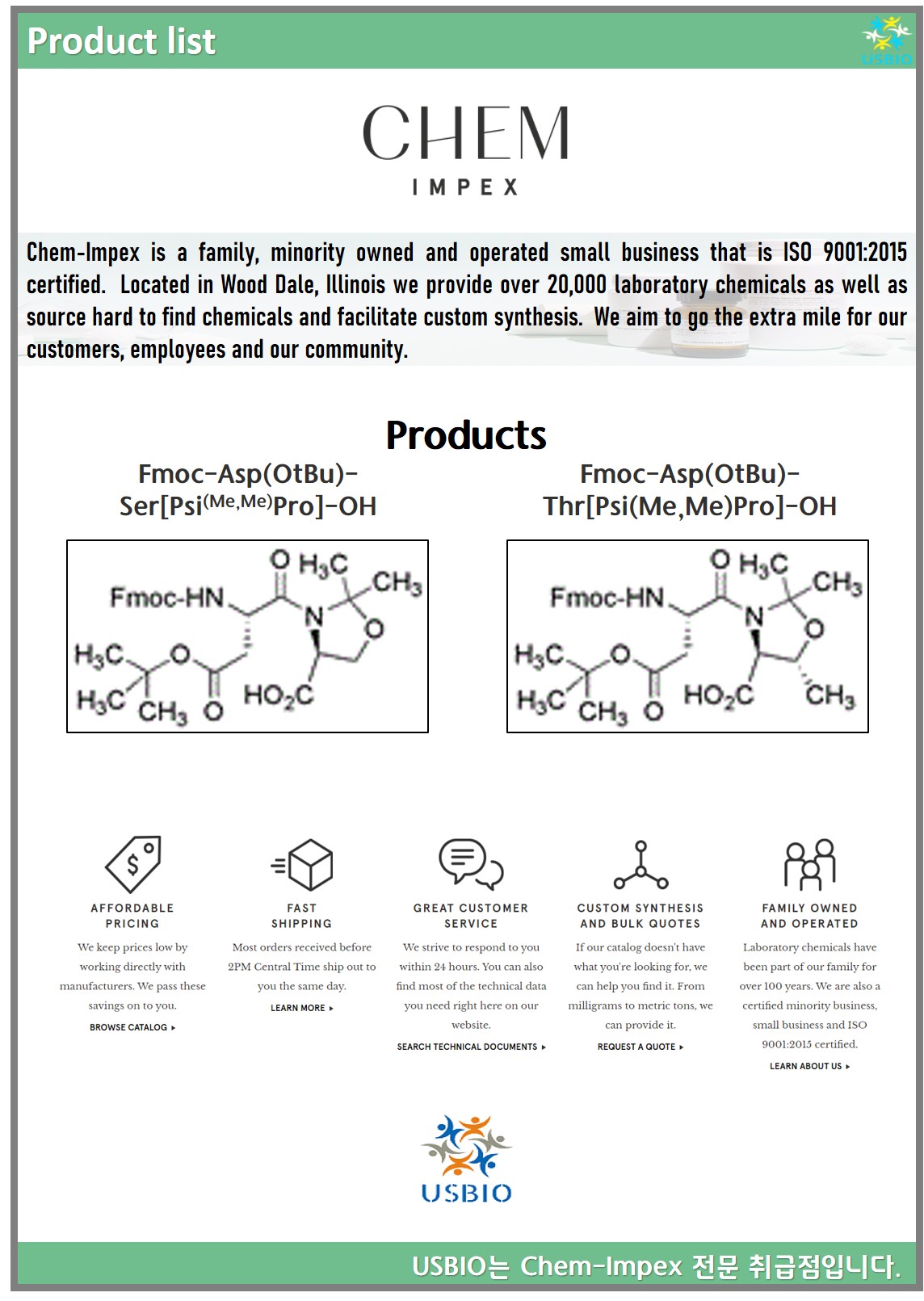 Chem-Impex는 1976년 화학자 Nitin Shah의해 설립되었으며, ISO 9001:2015 인증을 받은 중소기업입니다. Chem Impex는 20,000개가 넘는 실험실 화학 물질을 제공 할 뿐만 아니라 찾기 어려운 화학 물질을 공급하고 있습니다. Chem-Impex는 고객의 변화하는 요구를 민첩하고 유연하게 충족시키고 고객 및 지역 사회를 위해 더 많은 노력을 기울이는 것을 목표로 하고 있습니다. Chem Impex의 주요 제품으로는 Fmoc-Asp(OtBu)-Ser[Psi(Me,Me)Pro]-OH, COMPONENTS FOR BIOLOGICAL BUFFERS, AMINO ACID SEQUENCING REAGENTS 등이 있습니다.
