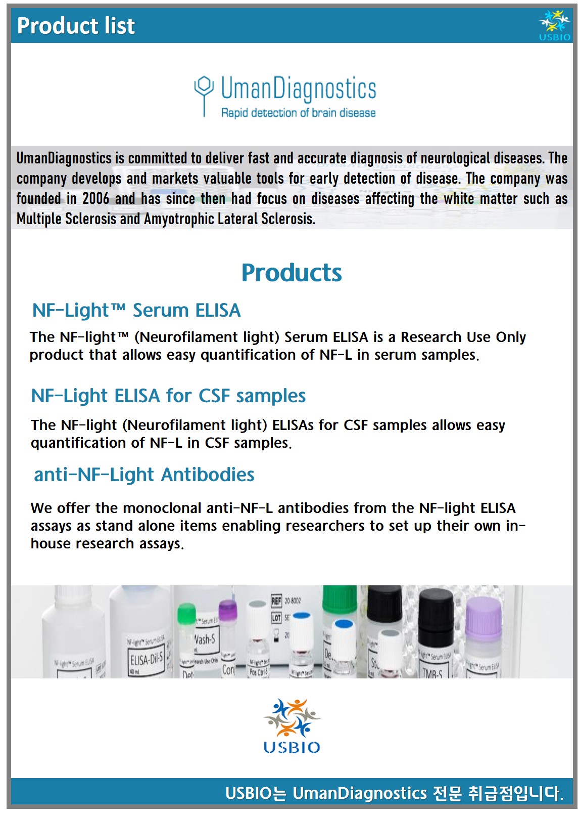 UmanDiagnostics는 2006년에 설립되었으며, 질병의 조기 발견을 위한 귀중한 도구를 개발 및 판매하고 뇌의 질병 탐지를 전문으로 하는 회사입니다. UmanDiagnostics은 다발성 경화증 및 근 위축성 측삭 경화증과 같은 백질에 영향을 미치는 질병에 초점을 두었습니다. UmanDiagnostics의 주요 제품으로는 NF-Light™ Serum ELISA, NF-Light ELISA for CSF samples, anti-NF-Light Antibodies 등이 있으며, UmanDiagnostics은 신경계 질환의 빠르고 정확한 진단을 고객에게 제공하기 위해 최선을 다하고 있습니다.