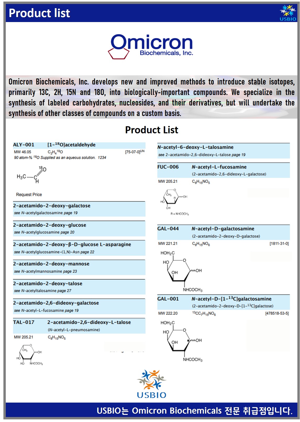 Omicron Biochemicals는 1982년에 앤서니 세리아니와 로버트 바커에 의해 효율적인 합성 및 정제를 위해 설립되었으며, 주로 13 C, 2 H, 15 N 및 18 O의 안정 동위 원소를 생물학적으로 중요한 화합물로 도입하기 위한 새롭고 개선된 방법을 개발하는 비상장 기업입니다. Omicron Biochemicals는 표지된 탄수화물, 뉴클레오사이드 및 그들의 유도체의 합성을 전문으로 하지만, 다른 종류의 화합물의 합성을 맞춤 제작이 가능하며, Omicron Biochemicals의 강점은 사이트별로 라벨이 부착된 화합물을 준비하는데 있지만 균일하게 라벨이 부착된 제품을 생산할 수 도 있습니다.