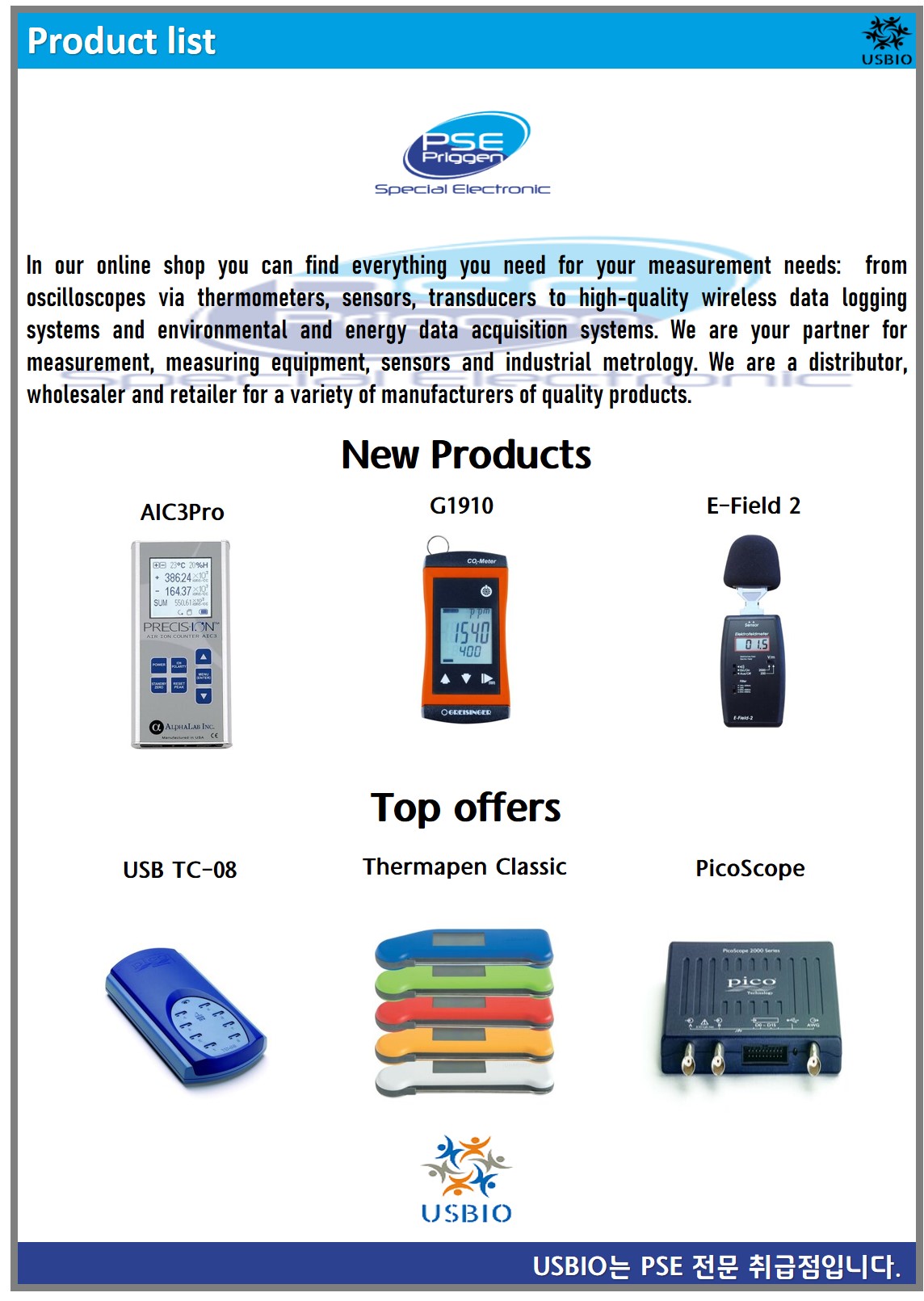 PSE(Priggen Special Electronic)는 측정기기, 데이터 로거 및 특수 전자 장치 전문업체로 오실로스코프에서 온도계, 센서, 변환기, 고품질 무선 데이터 로깅 시스템 및 에너지 데이터 수집 시스템에 이르기까지 측정 요구에 필요한 모든 것을 제공하고 있으며, 또 자동차 진단 오실로스코프, 측정 액세서리 및 EMC 차폐 재료도 공급하고 있습니다. PSE의 주요 제품으로는 USB Oscilloscopes, Mobile and Stationary Data Loggers, Manufacturer Independent Automotive Diagnostics Oscilloscopes, Portable Meters 등이 있습니다. PSE는 2,000개 이상의 제품을 공급하고 있으며 다양한 측정 파라미터에 적합한 제품을 제공하고 있습니다.