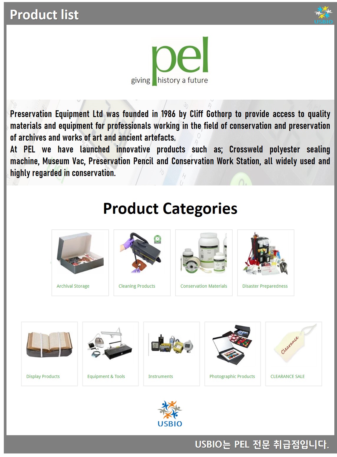 PEL(Preservation Equipment Ltd)는 Cliff Gothorp에 의해 설립되어 아카이브 및 예술 작품 및 고대 유물의 보존 및 보존 분야에서 일하는 전문가에게 고품질 재료 및 장비에 대한 액세스를 제공하고 있는 회사입니다. PEL가 제공하고 있는 제품 카테고리로는 Archival Storage, Cleaning Products, Conservation Materials, Disaster Preparedness, Display Products, Equipment & Tools Instruments, Photographic Products 등이 있으며 그 중 교차 용접 폴리 에스테르 씰링 기계, 박물관 Vac, 보존 연필 및 보존 워크 스테이션은 모두 널리 사용되고 보존 측면에서 높은 평가를 받고 있습니다.