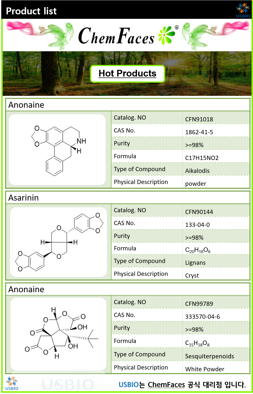 고품질 천연 제품 연구 및 개발 기업인 Chemfaces는 3000가지 이상의 다양한 천연 화합물을 공급하고 있으며 표준 96 웰 플레이트 패키지 등과 같은 맞춤형 패키지도 제공하고 있습니다. 또 Chemfaces는 T raditional Chinese Medicine의 참조 물질 및 활성 성분, 다양한 스크리닝 라이브러리 외에 더 많은 억제제 제품을 제공하고 있으며, 실험실 규모, 일부 제품 파일럿 규모에서 상업적 규모에 이르기까지 계약 연구, 계약 제조 및 공정 개발 서비스를 제공하고 있습니다. Chemfaces는 전문적으로 통합 된 R & D 그룹 및 생산 팀을 통해 고품질의 제품, 최고의 서비스, 다채로운 정보를 제공하며, 밀리그램 크기에서 그램까지 다양한 제품을 공급하고 있습니다.