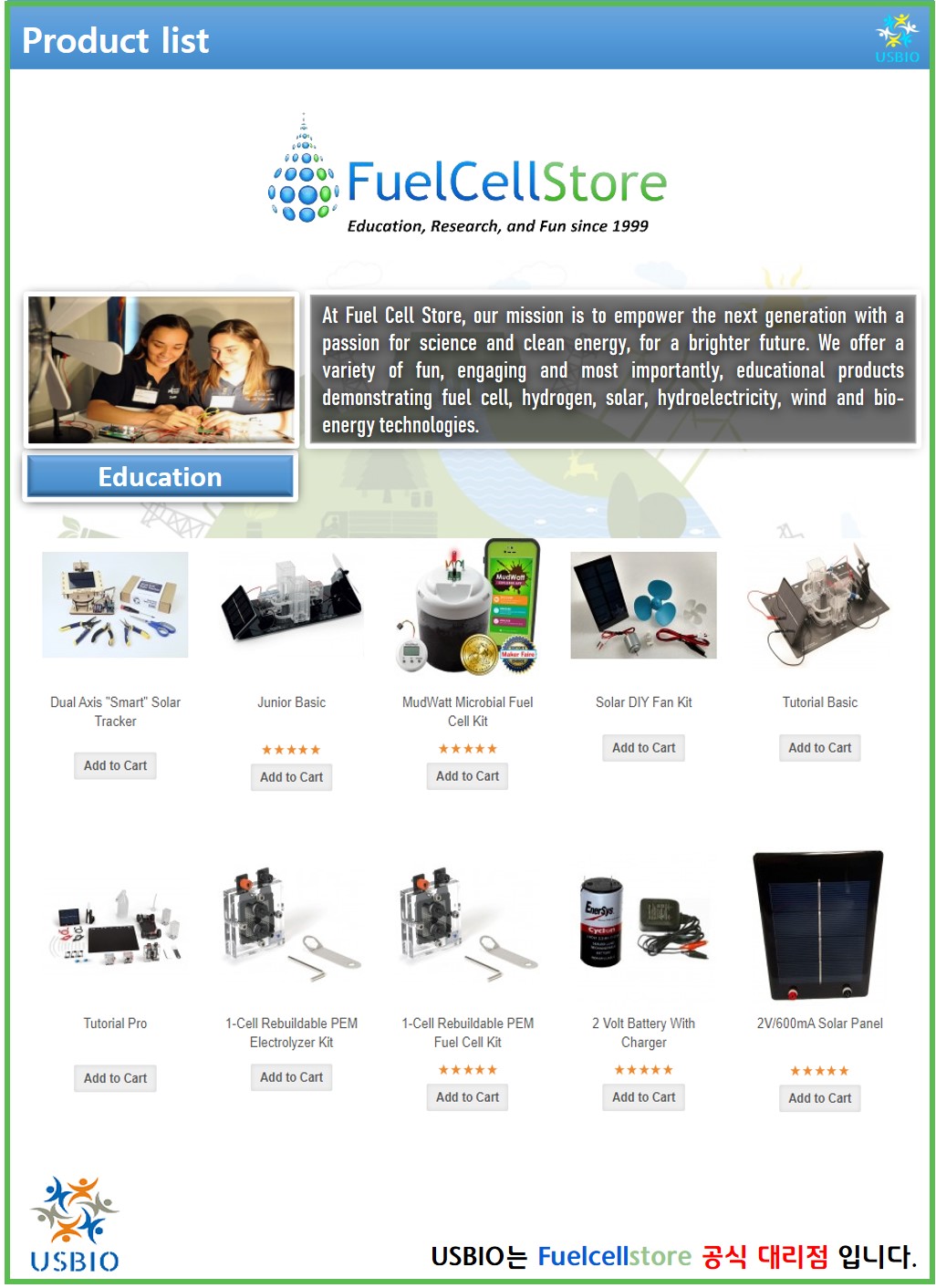 FuelCellStore는 재생 에너지 및 모든 연료 전지와 관련 된 제품을 공급하고 있는 업체로 가스 확산층, 가스 확산 전극, 촉매 및 막에서 가장 폭넓은 선택권을 제공하고 있으며, 세계적인 유명 공급업체의 최신 제품과 기술을 공급하고 있습니다. FuelCellStore는 교육, 과학, 여가 등 모든 분야에서 고품질의 연료 전지 솔루션을 제공하기 위해 노력하고 있으며, FuelCellStore에서 제공하는 모든 교육용 키트는 환경을 위한 '친환경'을 위해 지속 가능한 에너지에 대한 관심을 높이고 가르치기 위해 고안되었습니다. 또 FuelCellStore의 모든 키트는 STEM(과학, 기술, 공학, 수학)에 중점을 두고 있으며, 일부 키트에는 차세대 과학 표준(NGSS), 공통 핵심 영어 표준 및 공통 핵심 수학 표준 코드가 포함되어 있고, 일부 제품에는 교육 과정과 학생용 워크시트도 제공하고 있습니다.