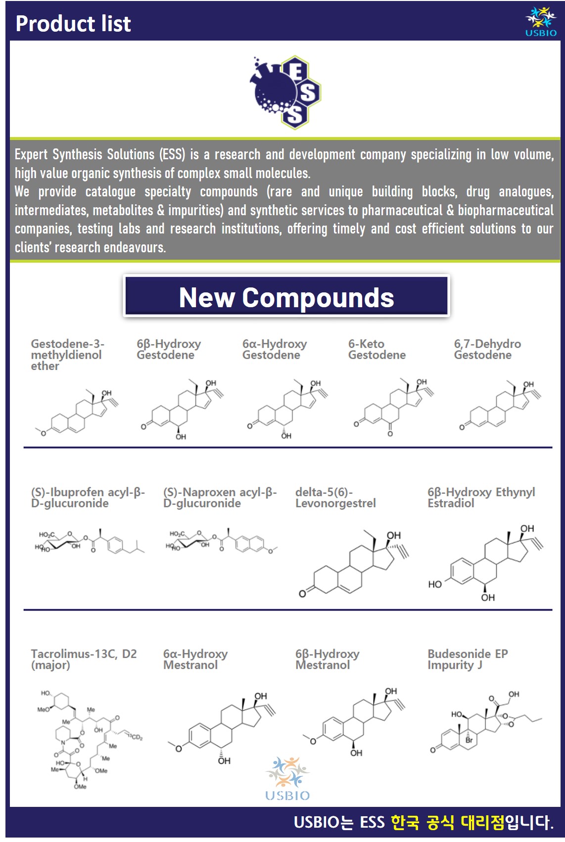 Expert Synthesis Solutions(ESS)는 복잡한 저분자의 소량, 고부가가치 유기 합성을 전문으로 하는 연구 개발 회사입니다. ESS는 경로 설계 및 최적화, 아민 화학, 헤테로사이클릭 화합물, 이소티오시아네이트, 천연 화합물 및 스테로이드 합성, 커플링 및 교차 커플링 반응, 수동 고체상 합성 등의 전문가입니다. ESS의 카탈로그 특수 화합물(희귀하고 독특한 구조 블록, 약물 유사체, 중간체, 대사 산물 및 불순물)과 합성 서비스를 제약 및 바이오 제약 회사, 테스트 연구소 및 연구 기관에 제공하여 고객의 연구 노력에 시기 적절하고 비용 효율적인 솔루션을 제공하고 있습니다. ESS의 주요 제품 카테고리로는 아민(Amines), 글루쿠로나이드(Glucuronides), 헤테로 고리 화합물(Heterocyclic Compounds), 이소티오시아네이트(Isothiocyanates), 표지된 화합물(Labeled Compounds), 대사 산물 & 불순물(Metabolites & Impurities), 스테로이드(Steroids) 등이 있습니다.